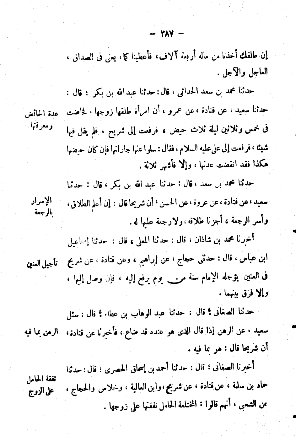 حَدَّثَنَا مُحَمَّد بْن سعد الحدائي، قال: حَدَّثَنَا عَبْدُ اللهِ بْن بكر؛ قال: حَدَّثَنَا سعيد، عَن قتادة، عَن عَمْرو، أن امرأ طلقها زوجها، فحاضت في خمس وثلاثين ليلة ثلاث حيض، فرفعت إِلَى شريح، فلم يقل فيها شيئاً، فرفعت إِلَى علي رضي الله عنه, فقال: سلوا عنها جاراتها فإن كان حيضها هكذا فقد انقضت عدتها، وإلا فأشهر ثلاثة.