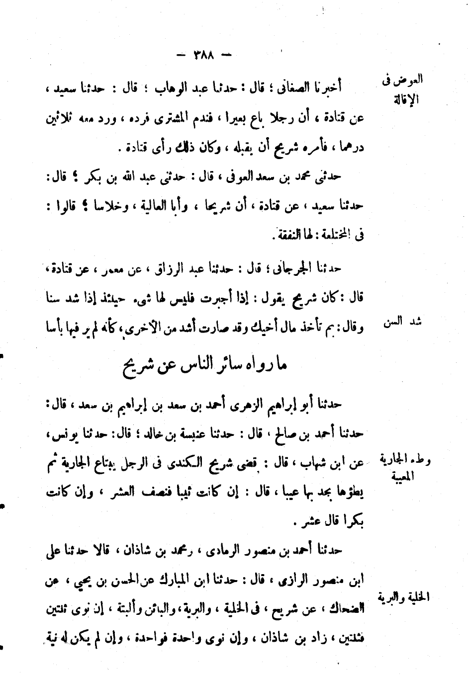 أَخْبَرَنَا الصغاني؛ قال: حَدَّثَنَا عَبْدُ الوهاب؛ قال: حَدَّثَنَا سعيد، عَن قتادة، أن رجلاً باع بعيراً، فندم المشتري فرده، ورد معه ثلاثين درهماً، فأمره شريح أن يقبله، وكان ذلك رأي قتادة.