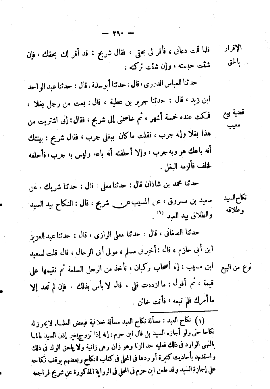 حَدَّثَنَا مُحَمَّد بْن شاذان قال: حَدَّثَنَا معلى قال: حَدَّثَنَا شريك، عَن سعيد بْن مسروق، عَن المسيب عَن شريح، قال: النكاح بيد السيد والطلاق بيد العَبْد.