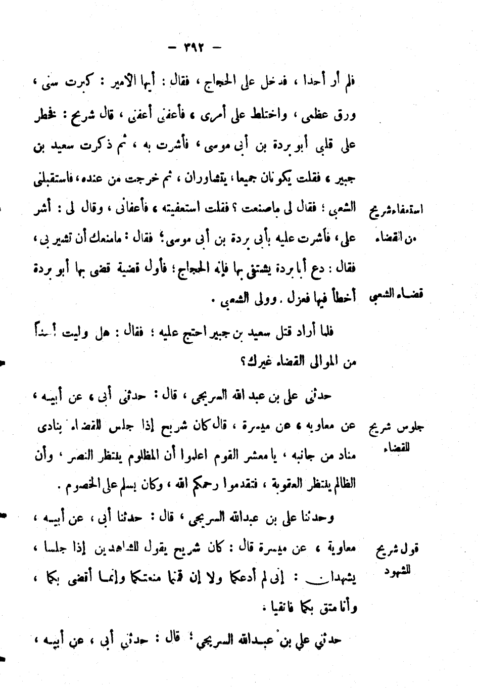 فلم أر أحداً، فدخل على الحجاج، فقال: أيها الأمير: كبرت سني، ورق عظمي، واختلط علي أمري، فأعفني أعفني، قَالَ: شريح: فخطر على قلبي أَبُو بردة بْن أبي موسى، فأشرت به، ثم ذكرت سعيد بْن جبير، فقلت يكونان جميعاً، يتشاوران، ثم خرجت من عنده، فاستقبلني الشعبي؛ فَقَالَ لي: ما صنعت ? فقلت استعفيته، فأعفاني، وقَالَ لي: أشر علي، فأشرت عليه بأبي بردة بْن أبي موسى؛ فقال: ما منعك أن تشير بي، فقال: دع أبا بردة يشتفي بها فإنه الحجاج؛ فأول قضية قضى بها أَبُو بردة أخطأ فيها فزل. وولى الشعبي. فلما أراد قتل سعيد بْن جبير احتج عليه؛ فقال: هَلْ وليت أحداً من الموالي القضاء غيرك ?