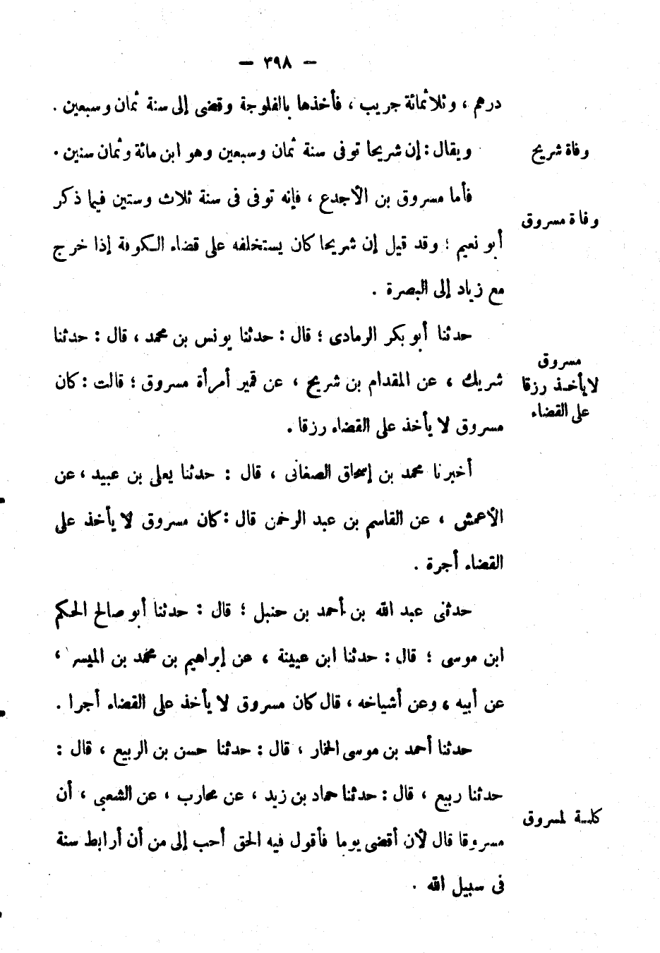 حَدَّثَنِي عَبْدُ اللهِ بْن أَحْمَد بْن حنبل؛ قال: حَدَّثَنَا أَبُو صالح الحكم ابن موسى؛ قال: حَدَّثَنَا ابن عيينة، عَن إبراهيم بْن مُحَمَّد بْن الميسر، عَن أبيه، وعن أشياخه، قَالَ: كان مسروق لا يأخذ على القضاء أجراً.