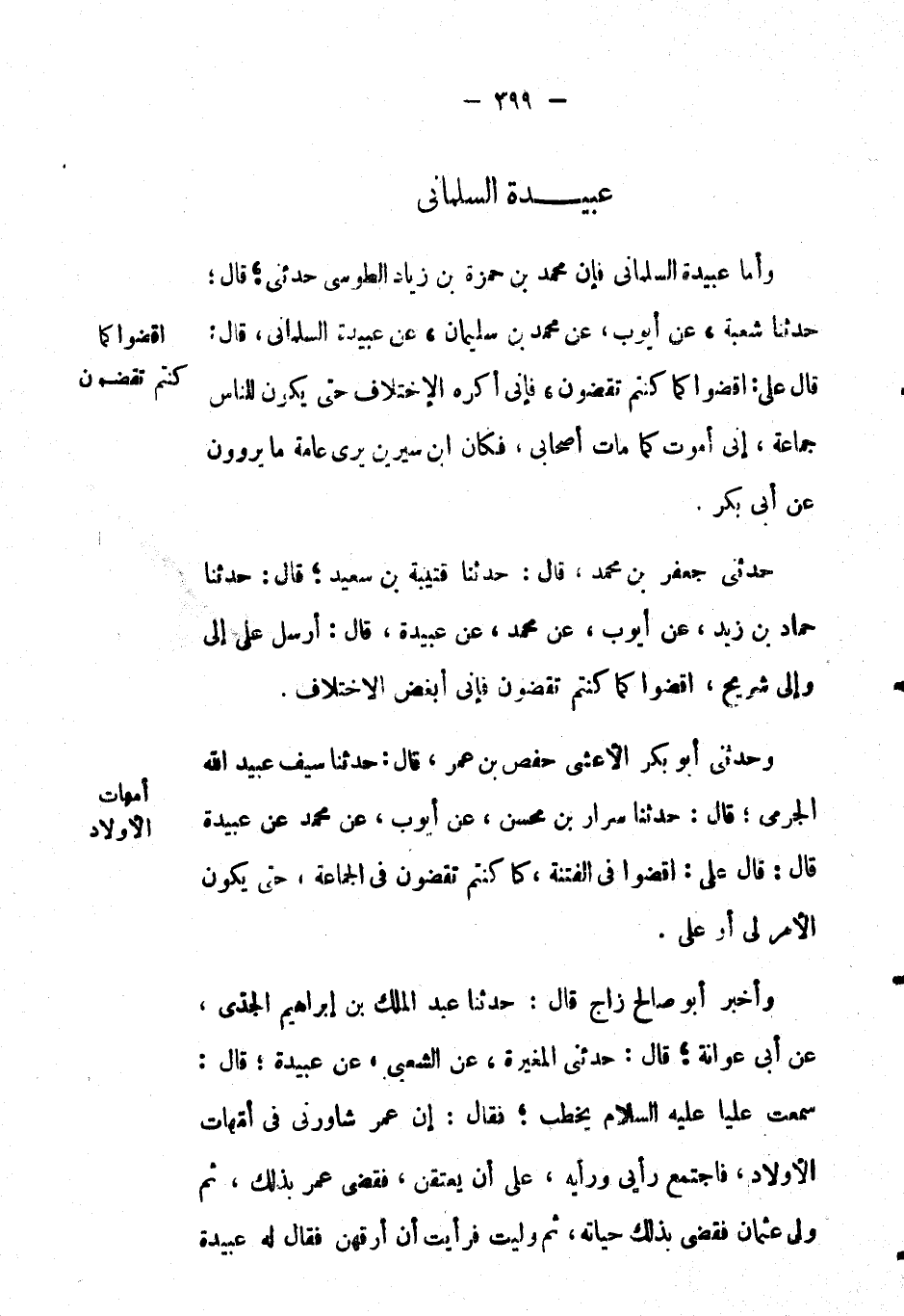 وأما عبيدة السلماني فإن مُحَمَّد بْن حمزة بْن زِيَاد الطوسي حَدَّثَنِي؛ قال؛ حَدَّثَنَا شعبة، عَن أيوب، عَن مُحَمَّد بْن سليمان، عَن عبيدة السلماني، قال: قَالَ: علي: اقضوا كما كنتم تقضون، فإني أكره الإختلاف حتى يكون للناس جماعة، إني أموت كما مات أصحابي، فكان ابن سيرين يرى عامة ما يروون عَن أبي بكر.