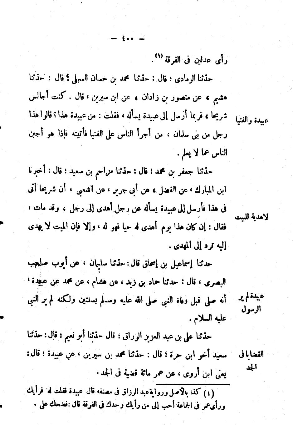 حَدَّثَنَا إسماعيل بْن إسحاق قال: حَدَّثَنَا سليمان، عَن أيوب صاحب البصري، قال: حَدَّثَنَا حماد بْن زيد، عَن هشام، عَن مُحَمَّد عَن عبيدة، أنه صلى قبل وفاة النَّبِيُّ صَلَّى اللَّهُ عَلَيْهِ وَسَلَّمَ بسنتين ولكنه لم ير النَّبِيّ صَلّى اللهُ عَلَيْهِ وَسَلَّمَ.