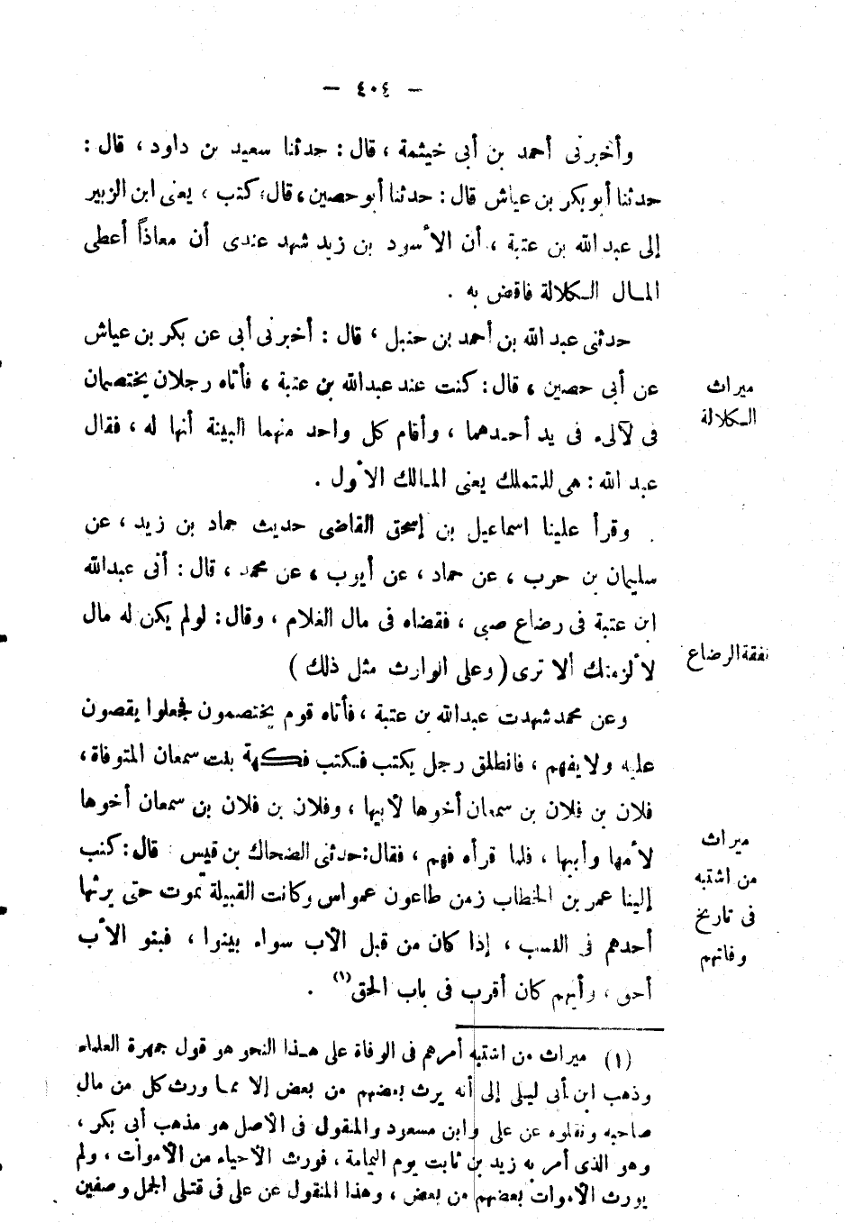 وأَخْبَرَنِي أَحْمَد بْن أبي خيثمة، قال: حَدَّثَنَا سعيد بْن داود، قال: حَدَّثَنَا أَبُو بكر بْن عياش قال: حَدَّثَنَا أَبُو حصين، قال، كتب، يعني ابن الزبير إِلَى عَبْدِ اللهِ بْن عتبة، أن الأسود بْن زيد شهد عندي أن معاذاً أعطى المال الكلالة فاقض به.