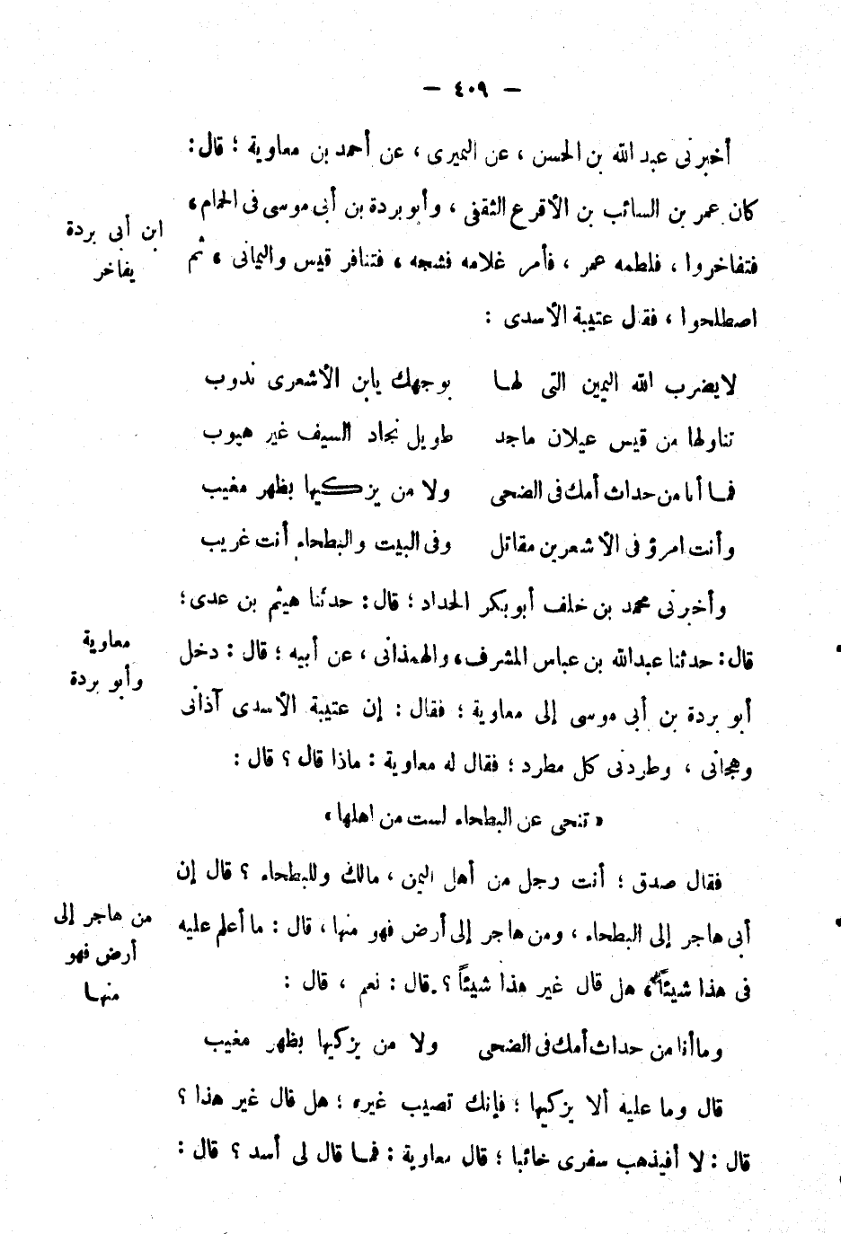 وأَخْبَرَنِي مُحَمَّد بْن خلف أَبُو بكر الحداد؛ قال: حَدَّثَنَا هيثم بْن عدي؛ قال: حَدَّثَنَا عَبْدُ اللهِ بْن عباس المشرف، والهمذاني، عَن أبيه؛ قال: دخل أَبُو بردة بْن أبي موسى إِلَى معاوية؛ فقال: إن عتيبة الأسدي آذاني وهجاني، وطردني كل مطرد؛ فَقَالَ لَهُ معاوية: ماذا قَالَ: ? قال: