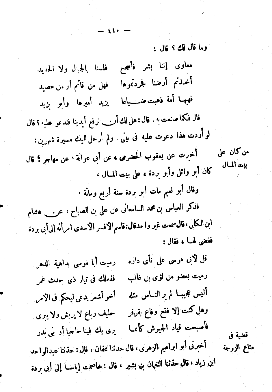 أَخْبَرَنِي أَبُو إبراهيم الزهري، قَالَ: حَدَّثَنَا عفان، قال: حَدَّثَنَا عَبْدُ الواحد ابن زياد، قَالَ: حَدَّثَنَا النعمان بْن بشير، قال: خاصمت إياساً إِلَى أبي بردة