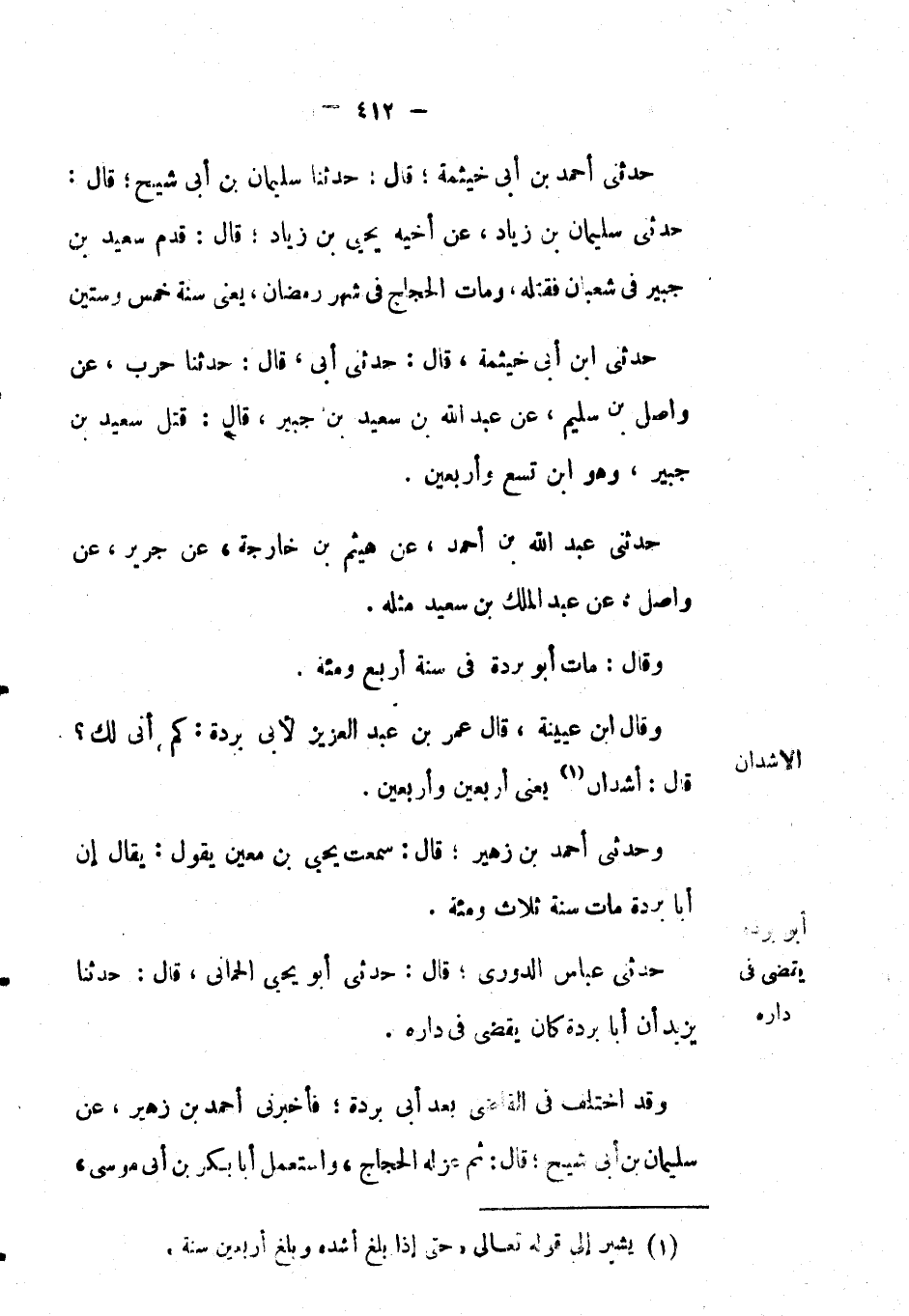 حَدَّثَنِي ابن أبي خيثمة، قال: حَدَّثَنِي أبي، قال: حَدَّثَنَا حرب، عَن واصل بْن سليم، عَنْ عَبْدِ اللهِ بْن سعيد بْن جبير، قال: قتل سعيد بْن جبير، وهو ابن تسع وأربعين.