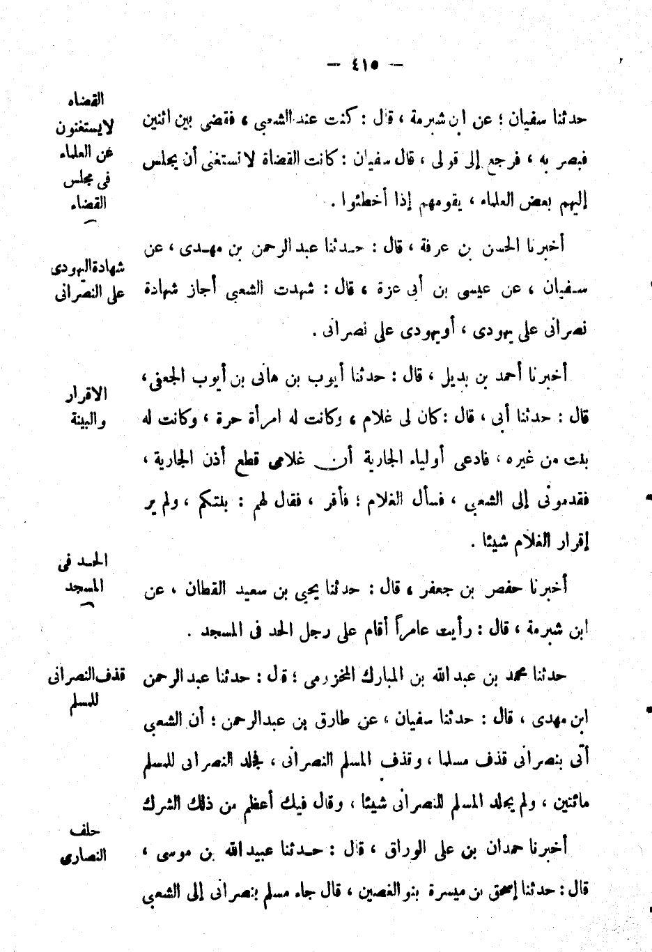 حَدَّثَنَا مُحَمَّد بْن عَبْد اللهِ بْن المبارك المخزومي؛ قال: حَدَّثَنَا عَبْدُ الرحمن ابن مهدي، قال: حَدَّثَنَا سُفْيَان، عَن طارق بْن عَبْد الرحمن؛ أن الشعبي أتى بنصراني قذف مسلماً، وقذف المسلم النصراني، فجلد النصراني للمسلم مائتين، ولم يجلد المسلم للنصراني شيئاً، وقَالَ: فيك أعظم من ذلك الشرك.