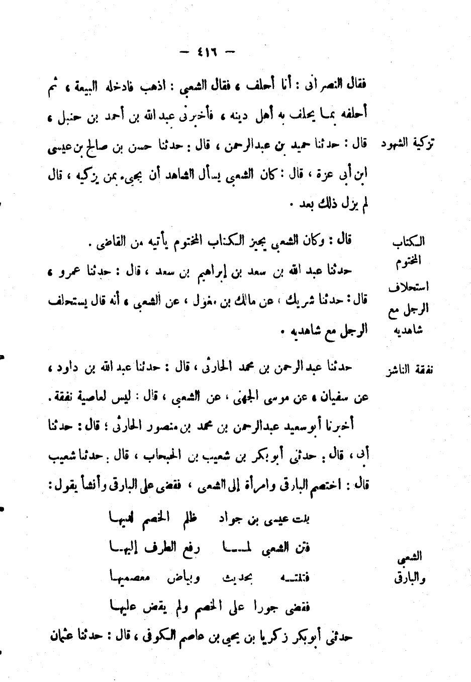 فأَخْبَرَنِي عَبْد اللهِ بْن أَحْمَد بْن حنبل، قال: حَدَّثَنَا حميد بْن عَبْد الرحمن، قال: حَدَّثَنَا حسن بْن صالح بْن عيسى ابن أبي عزة، قال: كان الشعبي يسأل الشاهد أن يجيء بمن يزكيه، قَالَ: لم يزل ذلك بعد. قال: وكان الشعبي يجيز الكتاب المختوم يأتيه من القاضي.