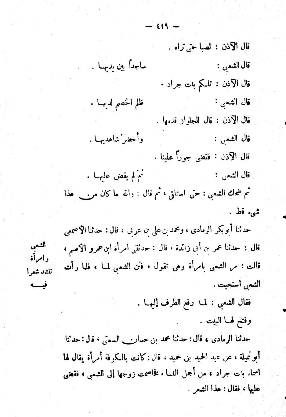 حَدَّثَنَا أَبُو بكر الرمادي، ومُحَمَّد بْن علي بْن عربي، قال: حَدَّثَنَا الأصمعي قال: حَدَّثَنَا عُمَر بْن أبي زائدة، قال: حدثتني امرأة ابن عَمْرو الأصم، قالت: مر الشعبي بامرأة وهي تقول: