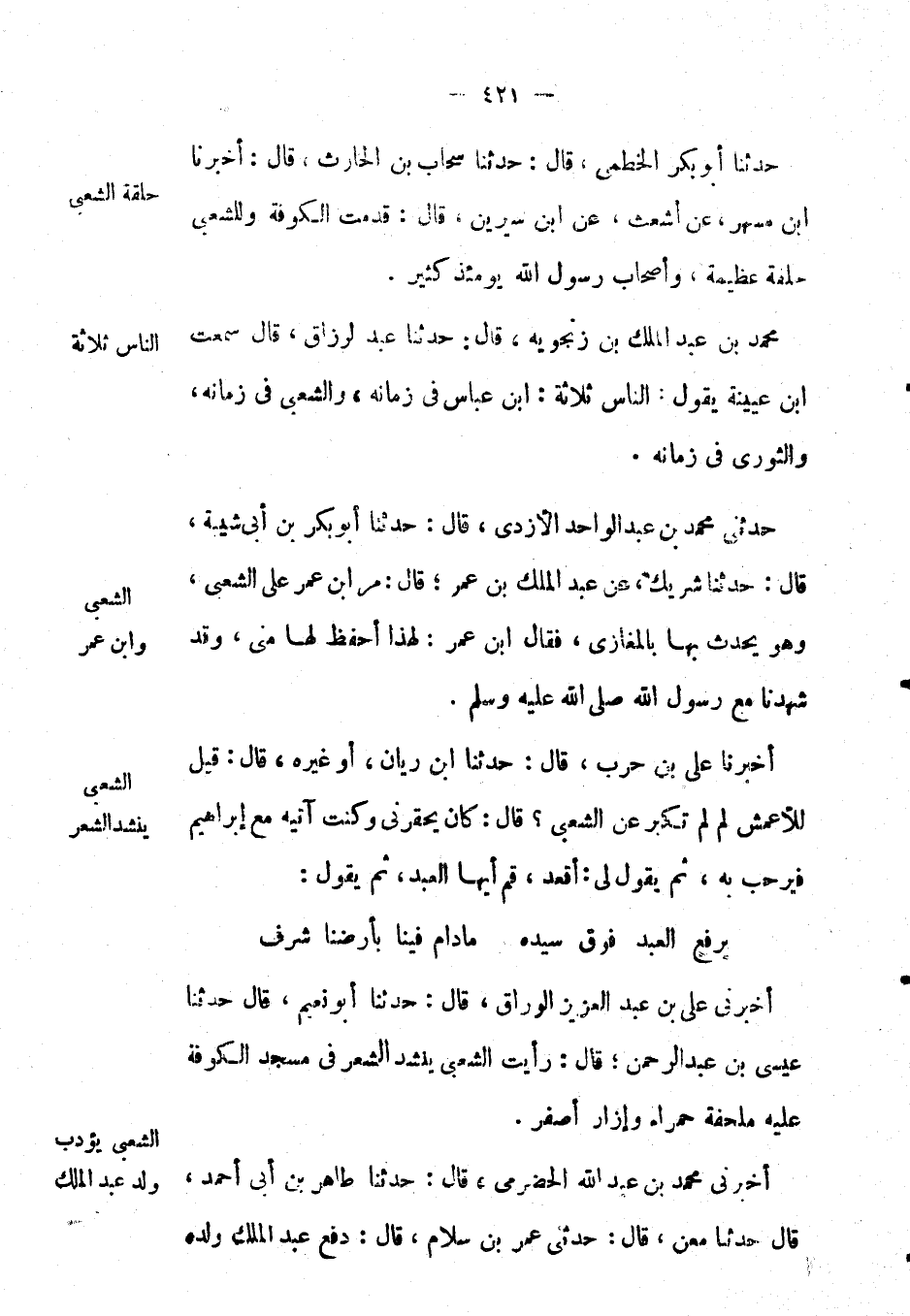 أَخْبَرَنِي علي بْن عَبْد العزيز الوراق، قال: حَدَّثَنَا أَبُو نعيم، قَالَ: حَدَّثَنَا عيسى بْن عَبْد الرحمن، قال: رأيت الشعبي ينشد الشعر في مسجد الكوفة عليه ملحفة حمراء وإزار أصفر.