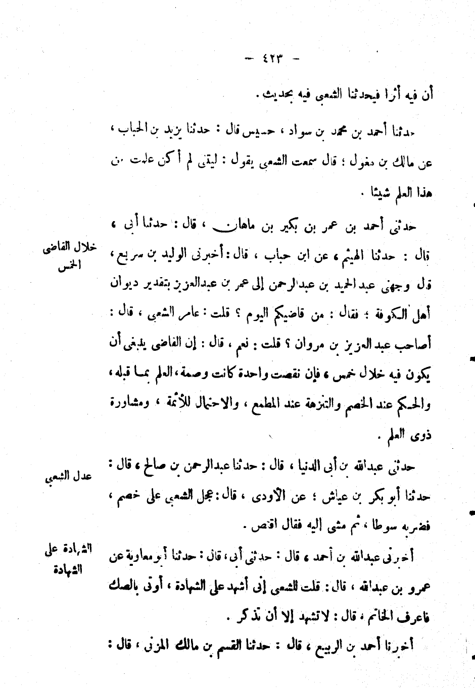 حَدَّثَنِي أَحْمَد بْن عُمَر بْن بكير بْن ماهان، قال: حَدَّثَنَا أبي، قال: حَدَّثَنَا الهيثم، عَن ابن حباب، قال: أَخْبَرَنِي الوليد بْن سريع، قَالَ: وجهني عَبْد الحميد بْن عَبْد الرحمن إِلَى عُمَر بْن عَبْد العزيز بتقدير ديوان أهل الكوفة؛ فقال: من قاضيكم اليوم ? قلت: عامر الشعبي، قال: أصاحب عَبْد العزيز بْن مروان ? قلت: نعم، قال: إن القاضي ينبغي أن يكون فِيْهِ خلال خمس، فإن نقصت واحدة كانت وصمة، العلم بما قبله، والحكم عند الخصم والتنزهة عند المطمع، والاحتمال للأئمة، ومشاورة ذوي العلم.
