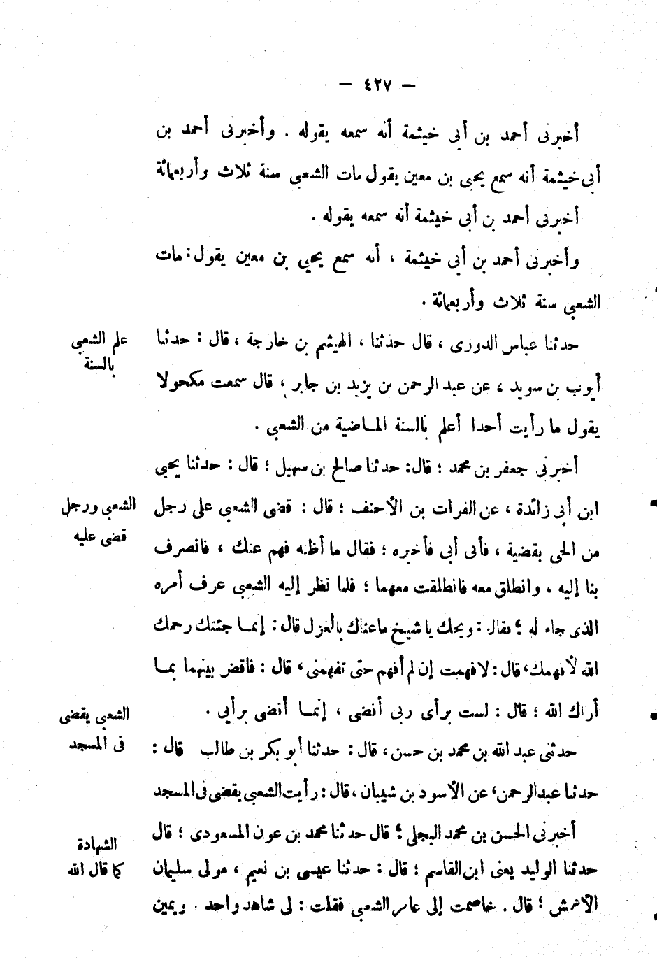 حَدَّثَنِي عَبْدُ اللهِ بْن مُحَمَّد بْن حسن، قال: حَدَّثَنَا أَبُو بكر بْن طالب قال: حَدَّثَنَا عَبْدُ الرحمن، عَن الأسود بْن شيبان، قال: رأيت الشعبي يقضي في المسجد.
