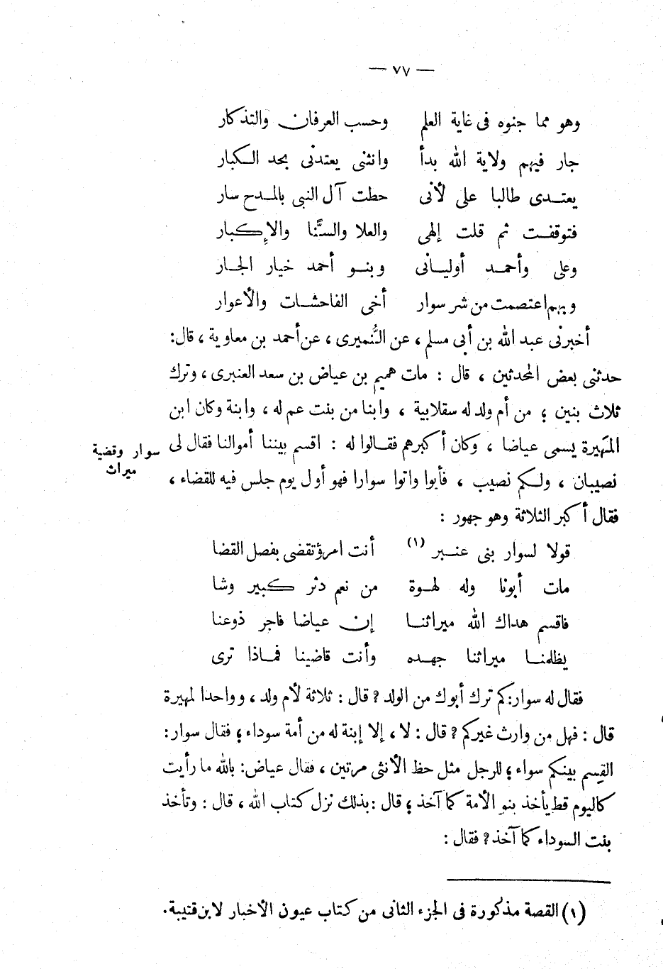 فَقَالَ لَهُ سوار: كم ترك أَبُوك من الولد ? قال: ثلاثة لأم ولد، وواحداً لمهيرة قال: فهل من وارث غيركم ? قال: لا، إِلَّا ابنة له من أمة سوداء؛ فَقَالَ: سوار: القسم بينكم سواء؛ للرجل مثل حظ الأنثى مرتين، فَقَالَ: عياض: بالله ما رأيت كاليوم قط يأخذ بنو الأمة كما آخذ؛ قال: بذلك نزل كتاب الله، قال: وتأخذ بنت السوداء كما آخذ ? فقال: