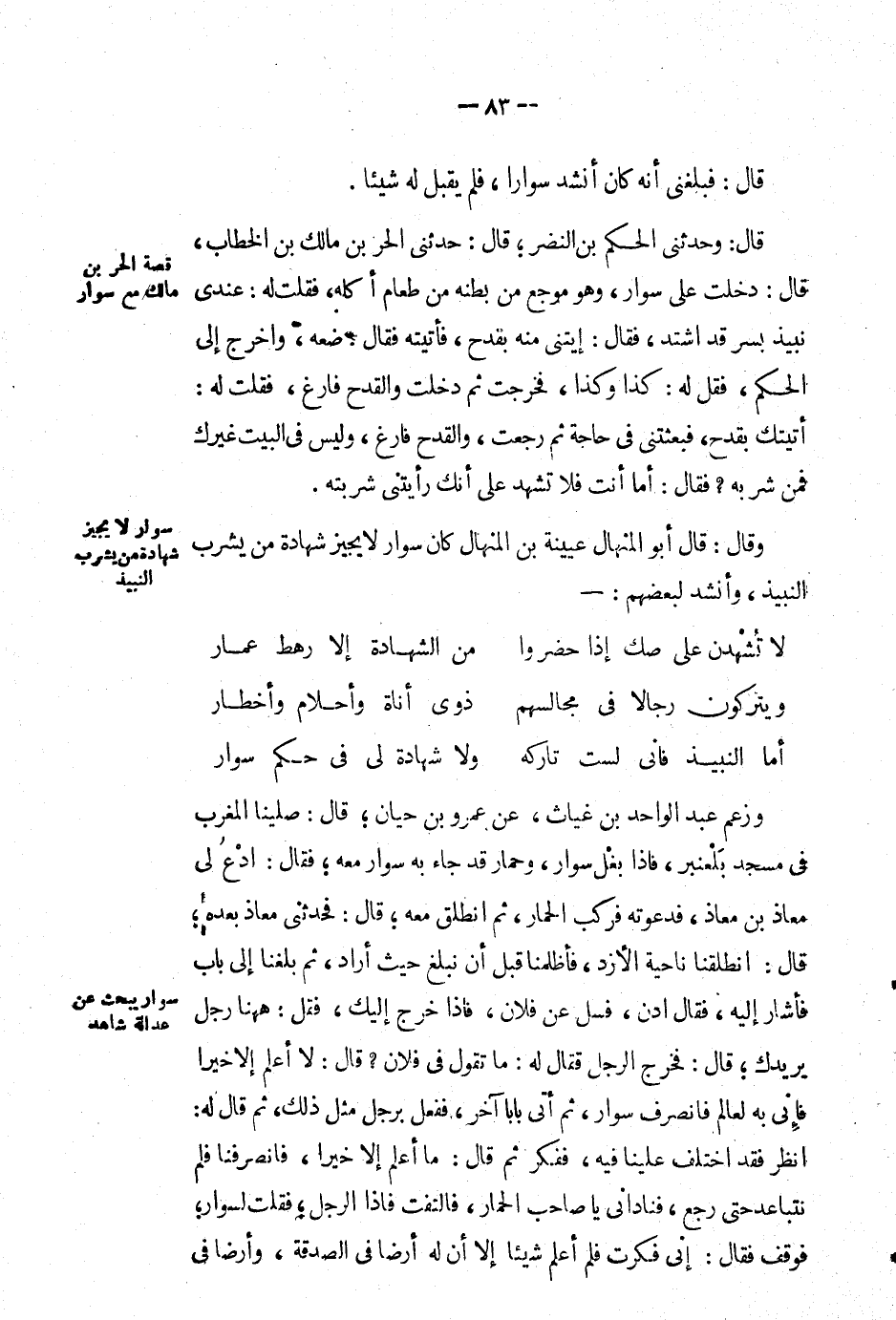 قال: وحَدَّثَنِي الحكم بْن النضر؛ قال: حَدَّثَنِي الحر بْن مالك بْن الخطاب، قال: دخلت على سوار، وهو موجع من بطنه من طعام أكله، فقلت له: عندي نبيذ بسر قد اشتد، فقال: إيتني منه بقدح، فأتيته فقال: ضعه، واخرج إِلَى الحكم، فقل له: كذا وكذا، فخرجت ثم دخلت والقدح فارغ، فقلت له: أتيتك بقدح، فبعثتني في حاجة ثم رجعت، والقدح فارغ، وليس في البيت غيرك فمن شربه ? فقال: أما أنت فلا تشهد على أنك رأيتني شربته.