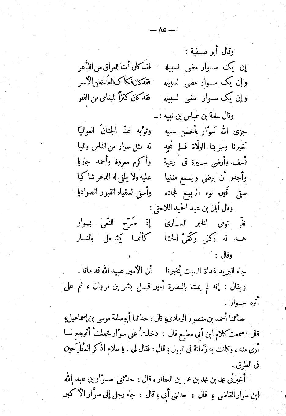 حَدَّثَنَا أَحْمَد بْن منصور الرمادي؛ قال: حَدَّثَنَا أَبُو سلمة موسى بْن إسماعيل؛ قال: سمعت كلام ابن أبي مطيع قال: دخلت على سوار فجعلت أتوجع لما أرى منه، وكانت به زمانة في البول؛ قال: فَقَالَ لي:. يا سلام اذكر المطرحين في الطرق.