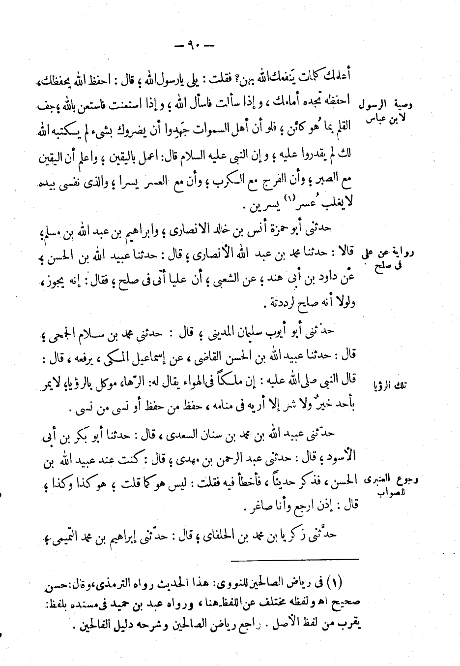أعلمك كلمات ينفعك الله بهن ? فقلت: بلى يا رسول الله؛ قال: احفظ الله يحفظك، احفظه تجده أمامك، وإذا سألت فاسأل الله؛ وإذا استعنت فاستعن بالله؛ جف القلم بما هو كائن؛ فلو أن أهل السموات جهدوا أن يضروك بشيء لم يكتبه الله لك لم يقدروا عليه؛ وإن النَّبِيّ صَلَّى اللَّهُ عَلَيْهِ وَسَلَّمَ قال: اعمل باليقين؛ واعلم أن اليقين مع الصبر؛ وأن الفرج مع الكرب؛ وأن مع العسر يسرا؛ والذي نفسي بيده لا يغلب عسر يسرين.