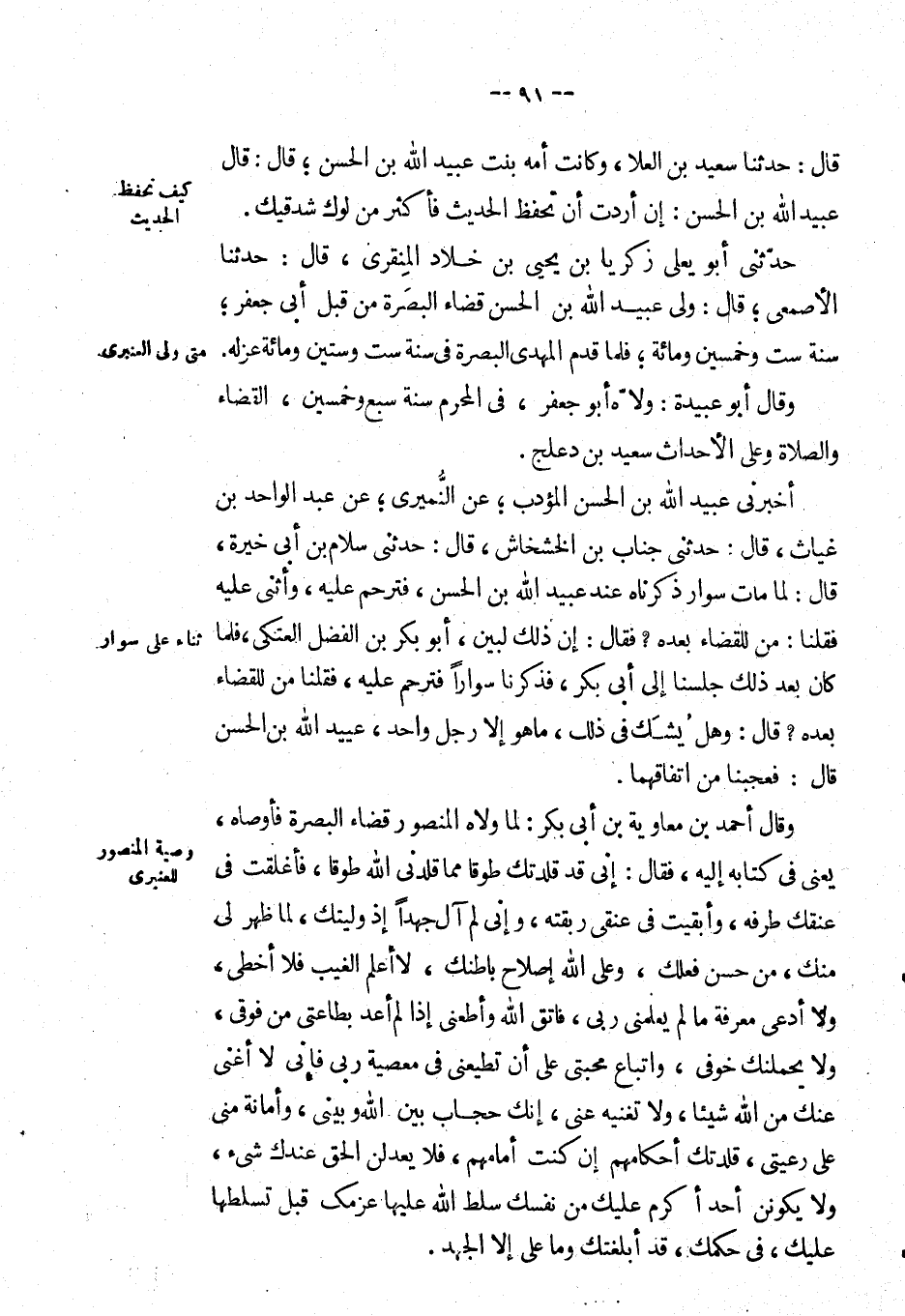 قال: حَدَّثَنَا سعيد بْن العلا، وكانت أمه بنت عبيد الله بْن الْحَسَن؛ قال: قَالَ: عبيد الله بْن الْحَسَن: إن أردت أن تحفظ الحديث فأكثر من لوك شدقيك. حَدَّثَنِي أَبُو يعلى زكريا بْن يحيى بْن خلاد المنقري، قال: حَدَّثَنَا الأصمعي؛ قال: ولي عبيد الله بْن الْحَسَن قضاء البصرة من قبل أبي جعفر؛ سنة ست وخمسين ومائة؛ فلما قدم المهدي البصرة في سنة ست وستين ومائة عزله.