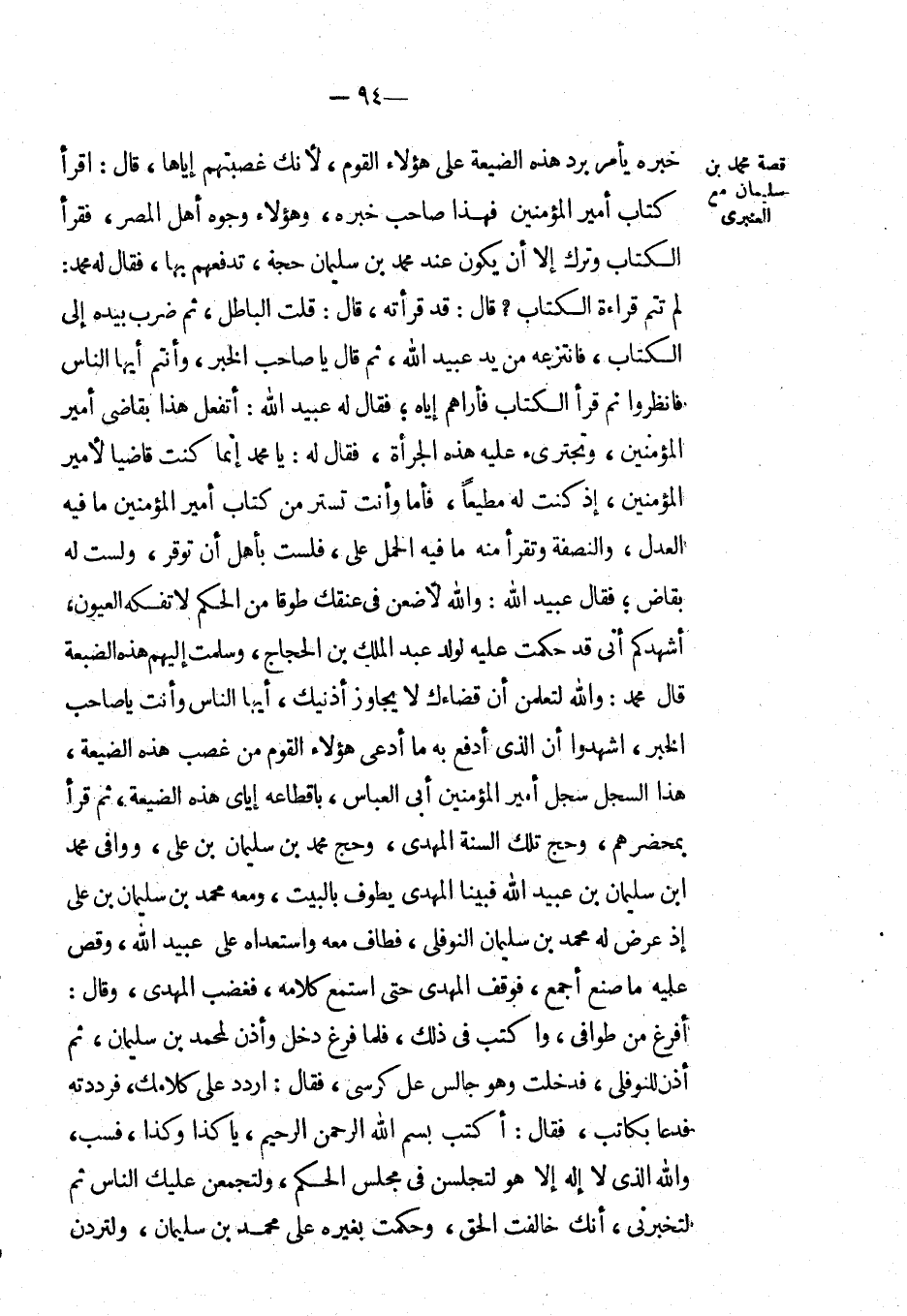 يا صاحب الخبر، اشهدوا أن الذي أدفع به ما أدعى هؤلاء القوم من غصب هذه الضيعة، هَذَا السجل سجل أمير المؤمنين أبي العباس، بإقطاعه إياي هذه الضيعة، ثم قرأ بمحضرهم.