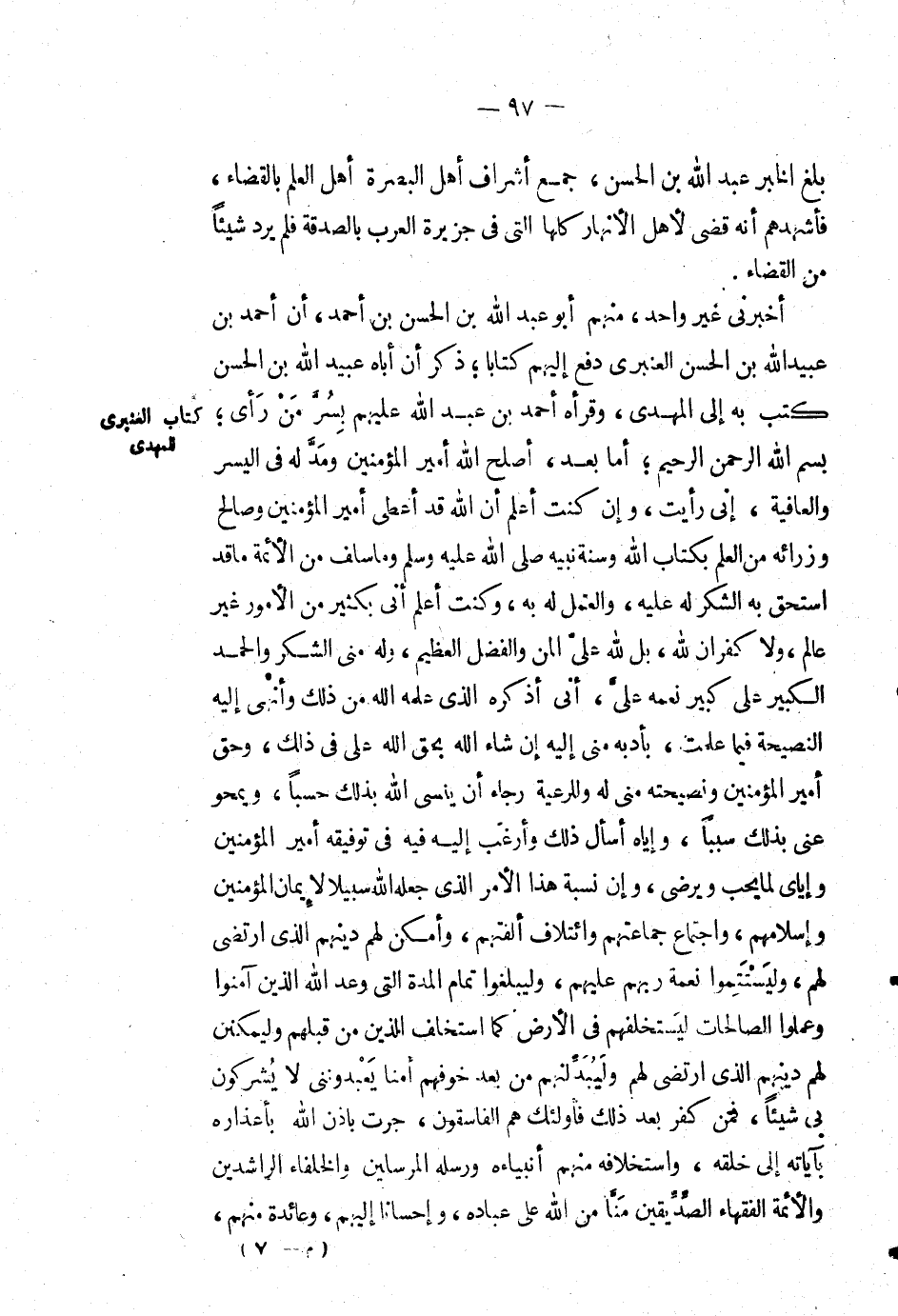 بلغ الخبر عَبْد اللهِ بْن الْحَسَن، جمع أشراف أهل البصرة أهل العلم بالقضاء، فأشهدهم أنه قضى لأهل الأنهار كلها التي في جزية العرب بالصدقة فلم يرد شيئاً من القضاء. أَخْبَرَنِي غير واحد، منهم أَبُو عَبْد اللهِ بْن الْحَسَن بْن أَحْمَد، أن أَحْمَد بْن عبيد الله بْن الْحَسَن العنبري دفع إليهم كتاباً؛ ذكر أن أباه عبيد الله بْن الْحَسَن كتب به إِلَى المهدي، وقرأه أَحْمَد بْن عَبْد اللهِ عليهم بسر من رأى؛ بِسْمِ اللهِ الرَّحْمَنِ الرَّحِيْمِ؛ أما بعد، أصلح الله أمير المؤمنين ومد له في اليسر والعافية، إني رأيت، وإن كنت أعلم أن الله قد أعطى أمير المؤمنين وصالح وزرائه من العلم بكتاب الله وسنة نبيه صَلَّى اللَّهُ عَلَيْهِ وَسَلَّمَ وما سلف من الأئمة ما قد استحق به الشكر له عليه، والعمل له به، وكنت أعلم أني بكثير من الأمور غير عالم، ولا كفران لله، بل لله علي المن والفضل العظيم، وله مني الشكر والحمد الكبير على كبير نعمه علي، أني أذكره الذي علمه الله من ذلك وأنهى إليه النصيحة فيما علمت، بأدبه مني إليه إن شاء الله بحق الله علي في ذلك، وحق أمير المؤمنين ونصيحته مني له وللرعية رجاء أن ينسى الله بذلك حسباً، ويمحو عني بذلك سبباً، وإياه أسأل ذلك وأرغب إليه فِيْهِ في توفيقه أمير المؤمنين وإياي لما يحب ويرضى، وإن نسبة هَذَا الأمر الذي جعله الله سبيلاً لإيمان المؤمنين وإسلامهم، واجتماع جماعتهم وائتلاف ألفتهم، وأمكن لهم دينهم الذي ارتضى لهم، وليستتموا نعمة ربهم عليهم، وليبلغوا تمام المدة التي: {وَعَدَ اللَّهُ الَّذِينَ آمَنُوا مِنكُمْ وَعَمِلُوا الصَّالِحَاتِ لَيَسْتَخْلِفَنَّهُم فِي الْأَرْضِ كَمَا اسْتَخْلَفَ الَّذِينَ مِن قَبْلِهِمْ وَلَيُمَكِّنَنَّ لَهُمْ دِينَهُمُ الَّذِي ارْتَضَى لَهُمْ وَلَيُبَدِّلَنَّهُم مِّن بَعْدِ خَوْفِهِمْ أَمْناً يَعْبُدُونَنِي لَا يُشْرِكُونَ بِي شَيْئاً وَمَن كَفَرَ بَعْدَ ذَلِكَ فَأُوْلَئِكَ هُمُ الْفَاسِقُونَ [النور: 55}