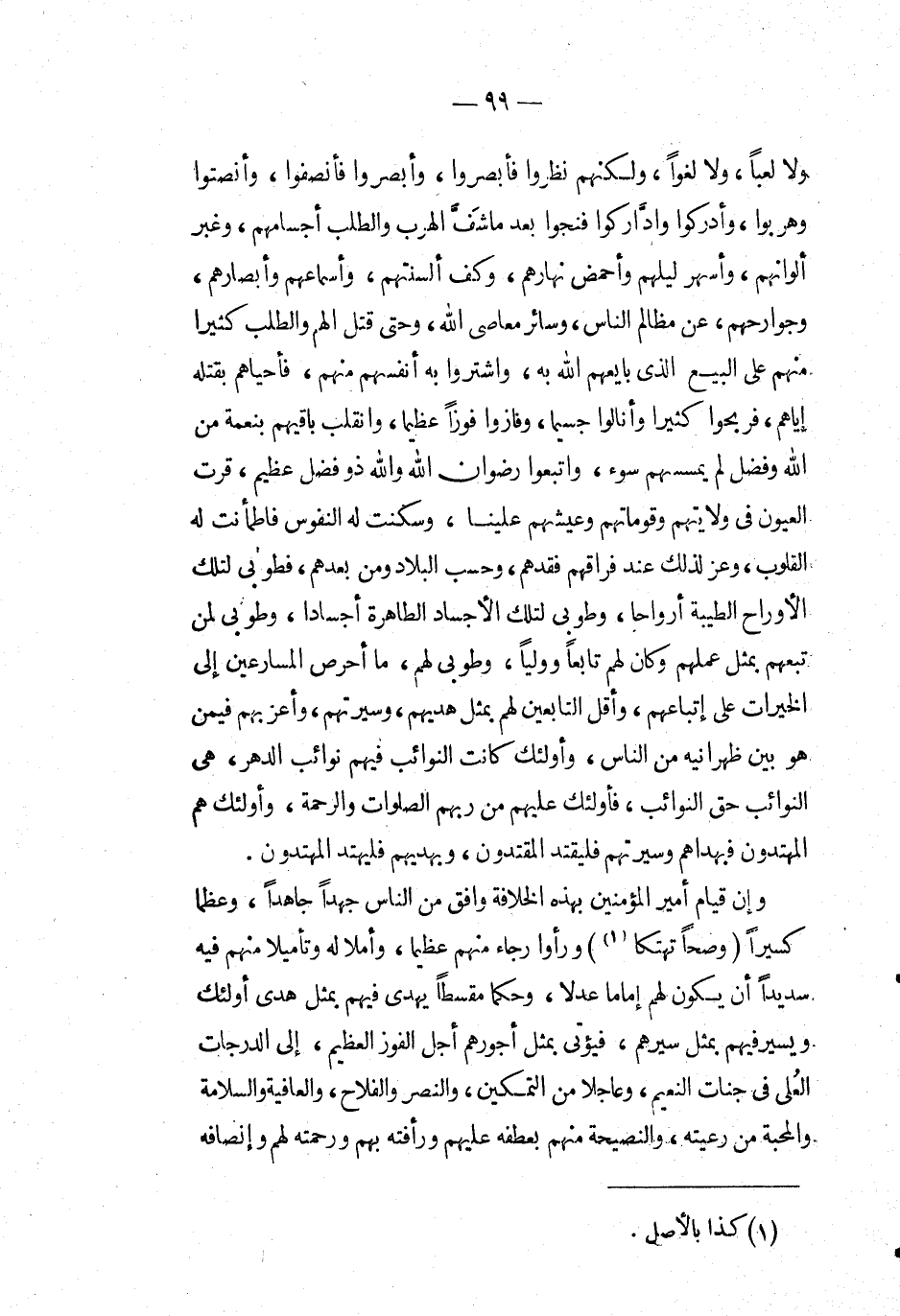 ولا لعباً، ولا لغواً، ولكنهم نظروا فأبصروا، وأبصروا فأنصفوا، وأنصتوا وهربوا، وأدركوا واداركوا فنجوا بعد ما شف الهرب والطلب أجسامهم، وغبر ألوانهم، وأسهر ليلهم وأحمض نهارهم، وكف ألسنتهم، وأسماعهم وأبصارهم، وجوارحهم، عَن مظالم الناس، وسائر معاصي الله، وحتى قتل الهم والطلب كثيراً منهم على البيع الذي بايعهم الله به، واشتروا به أنفسهم منهم، فأحياهم بقتله إياهم، فربحوا كثيراً وأنالوا جسيماً، وفازوا فوزاً عظيماً، وانقلب باقيهم بنعمة من الله وفضل لم يمسسهم سوء، واتبعوا رضوان الله والله ذو فضل عظيم، قرت العيون في ولايتهم وقوماتهم وعيشهم علينا، وسكنت له النفوس فاطمأنت له القلوب، وعز لذلك عند فراقهم فقدهم، وحسب البلاد ومن بعدهم، فطوبى لتلك الأوراح الطيبة أرواحاً، وطوبى لتلك الأجساد الطاهرة أجساداً، وطوبى لمن تبعهم بمثل عملهم وكان لهم تابعاً وولياً، وطوبى لهم، ما أحرص المسارعين إِلَى الخيرات على إتباعهم، وأقل التابعين لهم بمثل هديهم، وسيرتهم، وأعزبهم فيمن هو بين ظهرانيه من الناس، وأولئك كانت النوائب فيهم نوائب الدهر، هي النوائب حق النوائب، فأولئك عليهم من ربهم الصلوات والرحمة، وأولئك هم المهتدون فبهداهم وسيرتهم فليقتد المقتدون، وبهديهم فليهتد المهتدون.