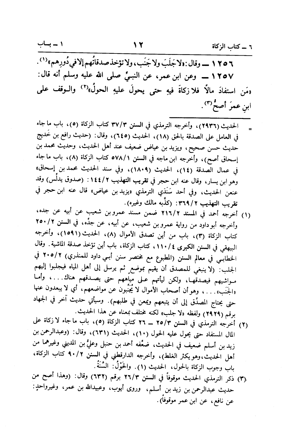 (¬2) أخرجه الترمذي في السنن 3/ 25 - 26 كتاب الزكاة (5)، باب ما جاء لا زكاة على المال المستفاد حتَّى يحول عليه الحول (10)، الحديث (631)، وقال: (وعبد الرحمن بن زيد بن أسلم ضعيف في الحديث، ضعَّفه أحمد بن حنبل وعليُّ بن المديني وغيرهما من أهل الحديث، وهو يكثر الغلط)، وأخرجه الدارقطني في السنن 2/ 90 كتاب الزكاة، باب وجوب الزكاة بالحول، الحديث (1). والحَوْلُ: السَّنَةُ.