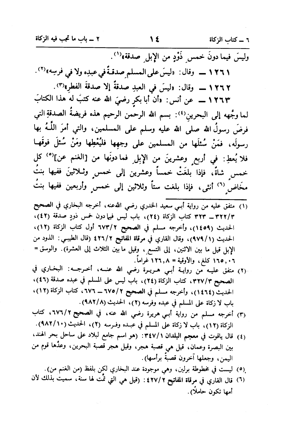 1263 - عن أنس: "أنَّ أبا بكرٍ رضيَ اللَّه عنه كتبَ له هذا الكتابَ لما وجَّهه إلى البحرينِ (¬4): بِسْمِ اللَّهِ الرَّحْمَنِ الرَّحِيمِ هذه فريضةُ الصدقةِ التي فرضَ رسولُ اللَّه صلى اللَّه عليه وسلم على المسلمين، والتي أمرَ اللَّهُ بها رسولَه، فمَنْ سُئلَها من المسلمين على وجهِها فليُعْطِها ومَنْ سُئلَ فوقَها فلا يُعطِ: في أربعٍ وعشرينَ من الإبِلِ فما دونَها من [الغنم عن] (¬5) كل خمسٍ شاةٌ، فإذا بلغَتْ خمسًا وعشرين إلى خمس وثلاثينَ ففيها بنتُ مخَاضٍ (¬6) أنثى، فإذا بلغت ستًا وثلاثين إلى خمس وأربعين ففيها بنتُ