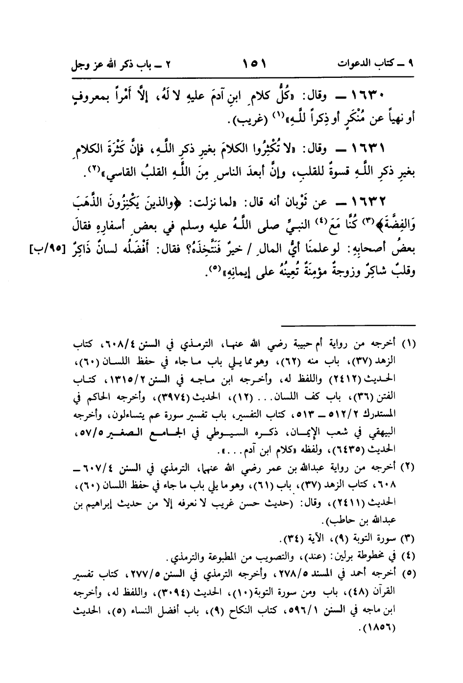 (¬2) أخرجه من رواية عبد اللَّه بن عمر رضي اللَّه عنهما، الترمذي في السنن 4/ 607 - 608، كتاب الزهد (37)، باب (61)، وهو ما يلي باب ما جاء في حفظ اللسان (60)، الحديث (2411)، وقال: (حديث حسن غريب لا نعرفه إلا من حديث إبراهيم بن عبد اللَّه بن حاطب).