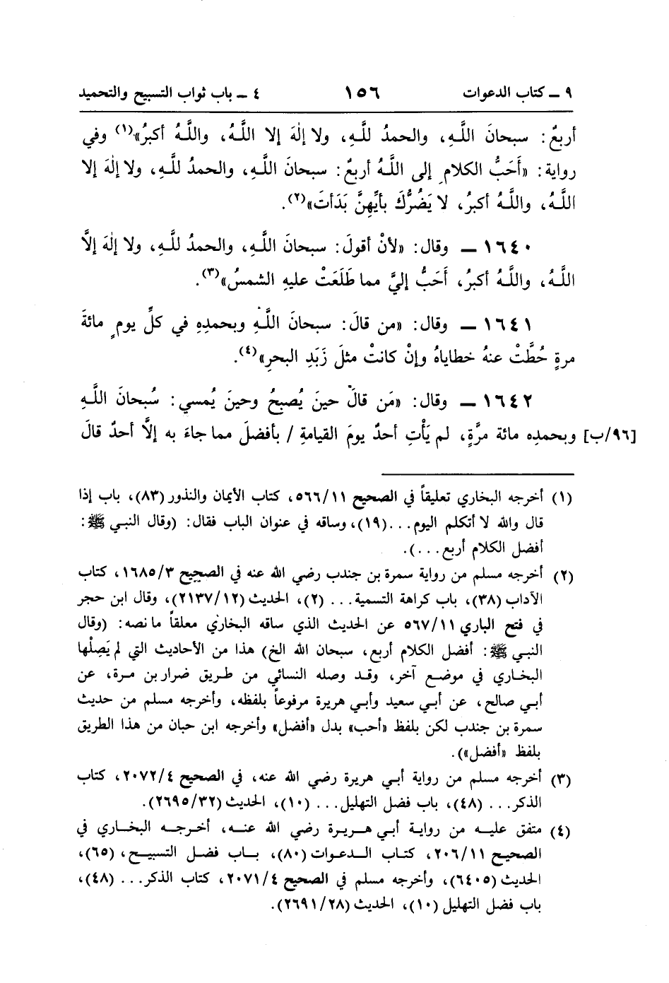 (¬4) متفق عليه من رواية أبي هريرة رضي اللَّه عنه، أخرجه البخاري في الصحيح 11/ 206، كتاب الدعوات (80)، باب فضل التسبيح، (65)، الحديث (6405)، وأخرجه مسلم في الصحيح 4/ 2071، كتاب الذكر. . . (48)، باب فضل التهليل (10)، الحديث (28/ 2691).