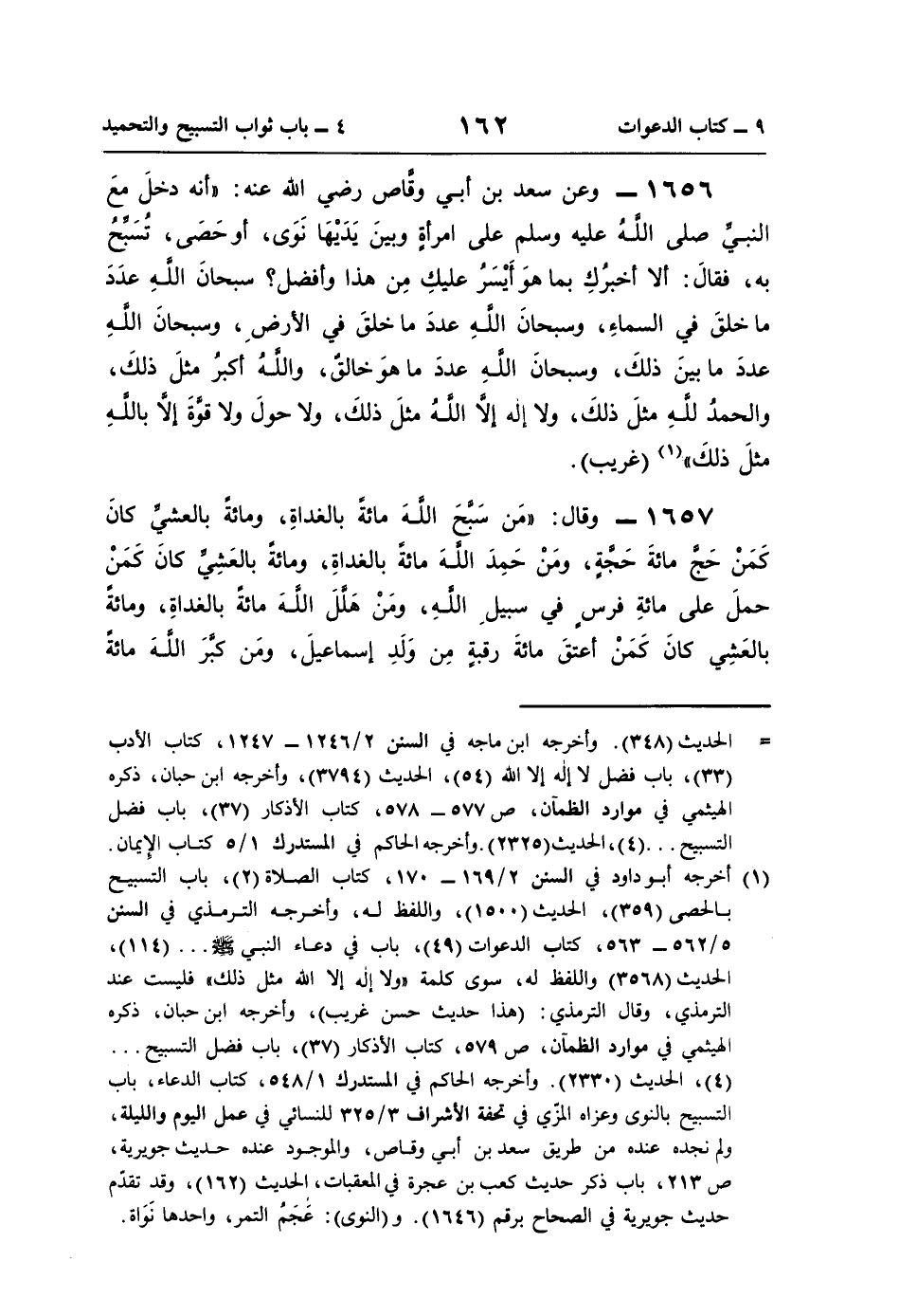 1656 - وعن سعد بن أبي وقَّاص رضي اللَّه عنه: "أنَّه دخلَ معَ النبيِّ صلى اللَّه عليه وسلم على امرأةٍ وبينَ يَدَيْهَا نَوَى، أو حَصَى، تُسَبِّحُ به، فقالَ: ألا أخبرُكِ بما هوَ أَيْسَرُ عليكِ مِن هذا وأفضل؟ سبحانَ اللَّهِ عدَدَ ما خلقَ في السماءِ، وسبحانَ اللَّهِ عددَ ما خلقَ في الأرضِ، وسبحانَ اللَّه عددَ ما بينَ ذلكَ، وسبحانَ اللَّهِ عددَ ما هوَ خالقٌ، واللَّهُ أكبرُ مثلَ ذلكَ، والحمدُ للَّه مثلَ ذلكَ، ولا إله إلَّا اللَّهُ مثلَ ذلكَ، ولا حولَ ولا قوةَ إلَّا باللَّهِ مثلَ ذلكَ" (¬1) (غريب).