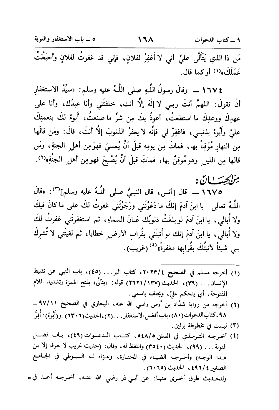 (¬2) أخرجه من رواية شداد بن أوس رضي اللَّه عنه، البخاري في الصحيح 11/ 97 - 98، كتاب الدعوات (80)، باب أفضل الاستغفار. . . (2)، الحديث (6306). و (أَبُوءُ): أُقِرُّ.