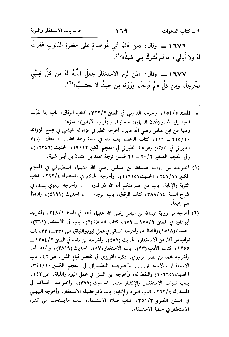 (¬2) أخرجه من رواية عبد اللَّه بن عباس رضي اللَّه عنهما، أحمد في المسند 1/ 248، وأخرجه أبو داود في السنن 2/ 178 - 179، كتاب الصلاة (2)، باب في الاستغفار (361)، الحديث (1518) واللفظ له، وأخرجه النسائي في عمل اليوم والليلة، ص 330 - 331، باب ثواب من أكثر من الاستغفار، الحديث (456)، وأخرجه ابن ماجه في السنن 2/ 1254 - 1255، كتاب الأدب (33)، باب الاستغفار (57)، الحديث (3819)، واللفظ له، وأخرجه محمد بن نصر المروزي، ذكره المقريزي في مختصر قيام الليل، ص 42، باب الاستغفار بالأسحار. . .، وأخرجه الطبراني في المعجم الكبير 10/ 342، الحديث (10665) واللفظ له، وأخرجه ابن السني في عمل اليوم والليلة، ص 142، باب ثواب الاستغفار والإكثار منه، الحديث (366)، وأخرجه الحاكم في المستدرك 4/ 262، كتاب التوبة والإنابة، باب ذكر فضيلة الاستغفار، وأخرجه البيهقي في السنن الكبرى 3/ 351، كتاب صلاة الاستسقاء، باب ما يستحب من كثرة الاستغفار في خطبة الاستسقاء.
