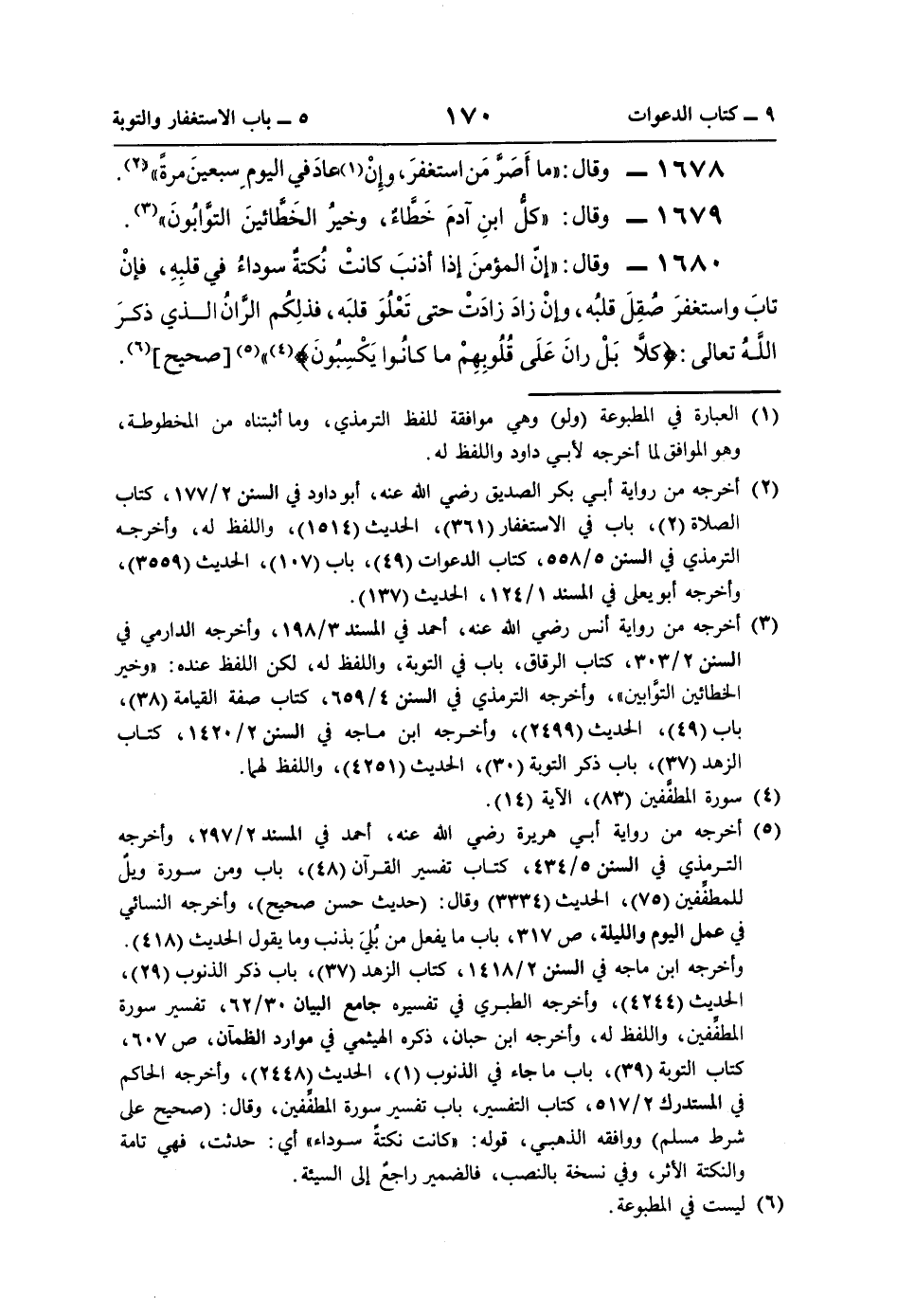 1680 - وقال: "إنَّ المؤمنَ إذا أذنبَ كانتْ نُكتةٌ سوداءُ في قلبِهِ، فإنْ تابَ واستغفرَ صُقِلَ قلبُه، وإنْ زادَ زادَتْ حتَّى تَعْلُوَ قلبَه، فذلِكُم الرَّانُ الذي ذكرَ اللَّه تعالى: {كَلَّا بَلْ رَانَ عَلَى قُلُوبِهِمْ مَا كَانُوا يَكْسِبُونَ} (¬4) " (¬5) [صحيح] (¬6).