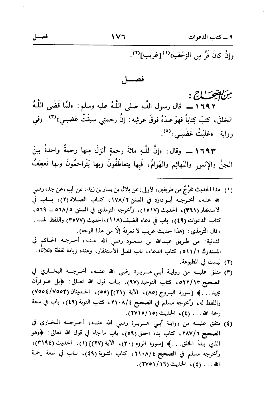 (¬3) متفق عليه من رواية أبي هريرة رضي اللَّه عنه، أخرجه البخاري في الصحيح 13/ 522، كتاب التوحيد (97)، باب قول اللَّه تعالى: {بَلْ هُوَ قُرْآنٌ مَجِيدٌ. . .} [سورة البروج (85)، الآية (21)] (55)، الحديثان (7553/ 7554) واللفظ له، وأخرجه مسلم في الصحيح 4/ 2108، كتاب التوبة (49)، باب في سعة رحمة اللَّه. . . (4)، الحديث (15/ 2715).