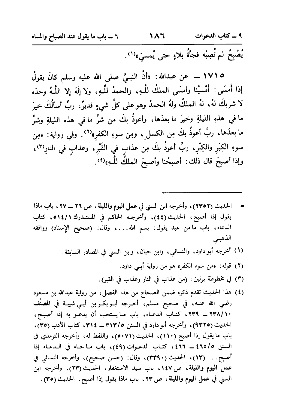 1715 - عن عبد اللَّه: "أنَّ النبيَّ صلى اللَّه عليه وسلم كانَ يقولُ إذا أَمسَى: أَمْسيْنا وأمسَى الملكُ للَّهِ، والحمدُ للَّهِ، ولا إلهَ إلَّا اللَّهُ وحدَه لا شريكَ لهُ، لهُ الملكُ ولهُ الحمدُ وهو على كلِّ شيءٍ قديرٌ، ربِّ أسالُكَ خيرَ ما في هذهِ الليلةِ وخيرَ ما بعدَها، وأعوذُ بكَ من شرِّ ما في هذه الليلةِ وشرِّ ما بعدَها، ربِّ أعوذُ بكَ مِن الكسلِ، ومِن سوءِ الكفرِ" (¬2). وفي رواية: "مِن سوءِ الكِبَرِ والكِبْرِ، ربِّ أعوذُ بكَ مِن عذابٍ في القَبْرِ، وعذابٍ في النَّارِ (¬3)، وإذا أصبحَ قال ذلك: أصبحْنا وأصبحَ الملكُ للَّهِ" (¬4).