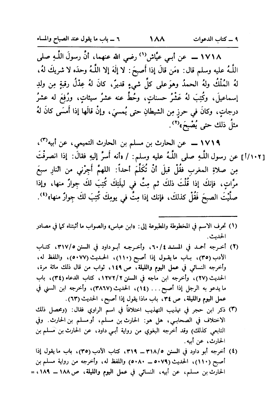 (¬4) أخرجه أبو داود في السنن 5/ 318 - 319، كتاب الأدب (35)، باب ما يقول إذا أصبح (110)، الحديث (5079 - 5080) واللفظ له، وأخرجه من رواية مسلم بن الحارث بن مسلم، عن أبيه، النسائي في عمل اليوم والليلة، ص 188 - 189، =