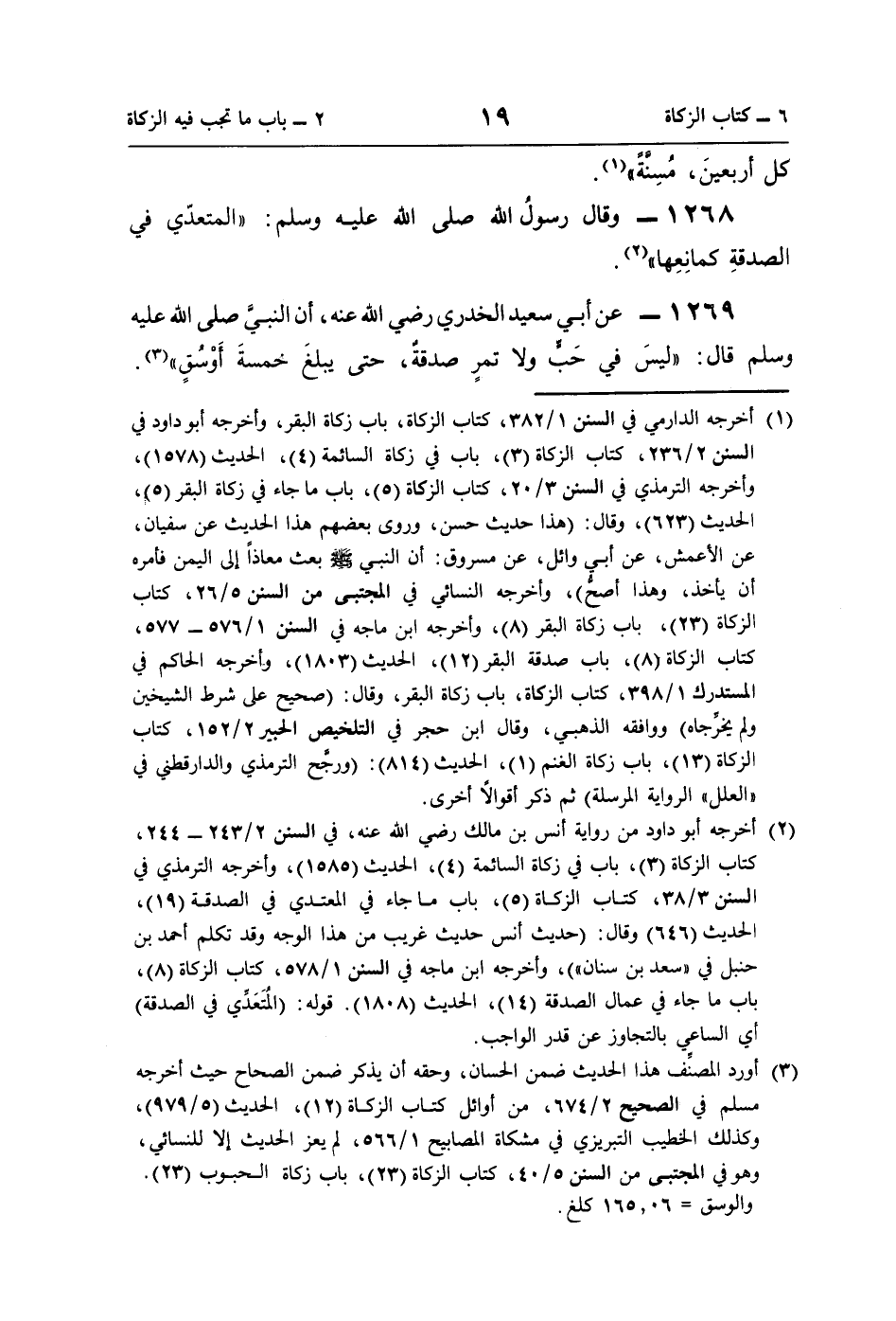 (¬2) أخرجه أبو داود من رواية أنس بن مالك رضي اللَّه عنه، في السنن 2/ 243 - 244، كتاب الزكاة (3)، باب في زكاة السائمة (4)، الحديث (1585)، وأخرجه الترمذي في السنن 3/ 38، كتاب الزكاة (5)، باب ما جاء في المعتدي في الصدقة (19)، الحديث (646) وقال: (حديث أنس حديث غريب من هذا الوجه وقد تكلم أحمد بن حنبل في "سعد بن سنان")، وأخرجه ابن ماجه في السنن 1/ 578، كتاب الزكاة (8)، باب ما جاء في عمال الصدقة (14)، الحديث (1808). قوله: (المُتَعَدِّي في الصدقة) أي الساعي بالتجاوز عن قدر الواجب.