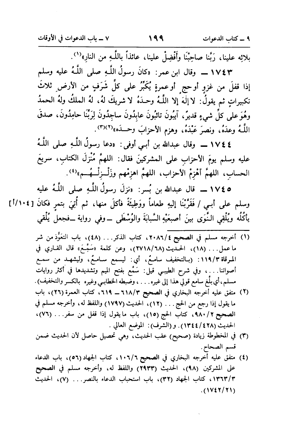 1743 - وقال ابن عمر: "كانَ رسولُ اللَّه صلى اللَّهُ عليه وسلم إذا قفلَ من غزوٍ أو حجٍ أو عمرةٍ يُكَبِّرُ على كلِّ شَرَفٍ من الأرضِ ثلاثَ تكبيراتٍ ثم يقولُ: لا إلهَ إلَّا اللَّهُ وحدَهُ لا شريكَ لهُ، لهُ الملكُ ولهُ الحمدُ وهُوَ على كلِّ شيءٍ قديرٌ، آيبُونَ تائبُونَ عابِدُونَ ساجِدُونَ لِرَبِّنَا حامِدُونَ، صدقَ اللَّهُ وعدَهُ، ونصرَ عَبْدَهُ، وهزم الأحزابَ وحدَه" (¬2) (¬3).