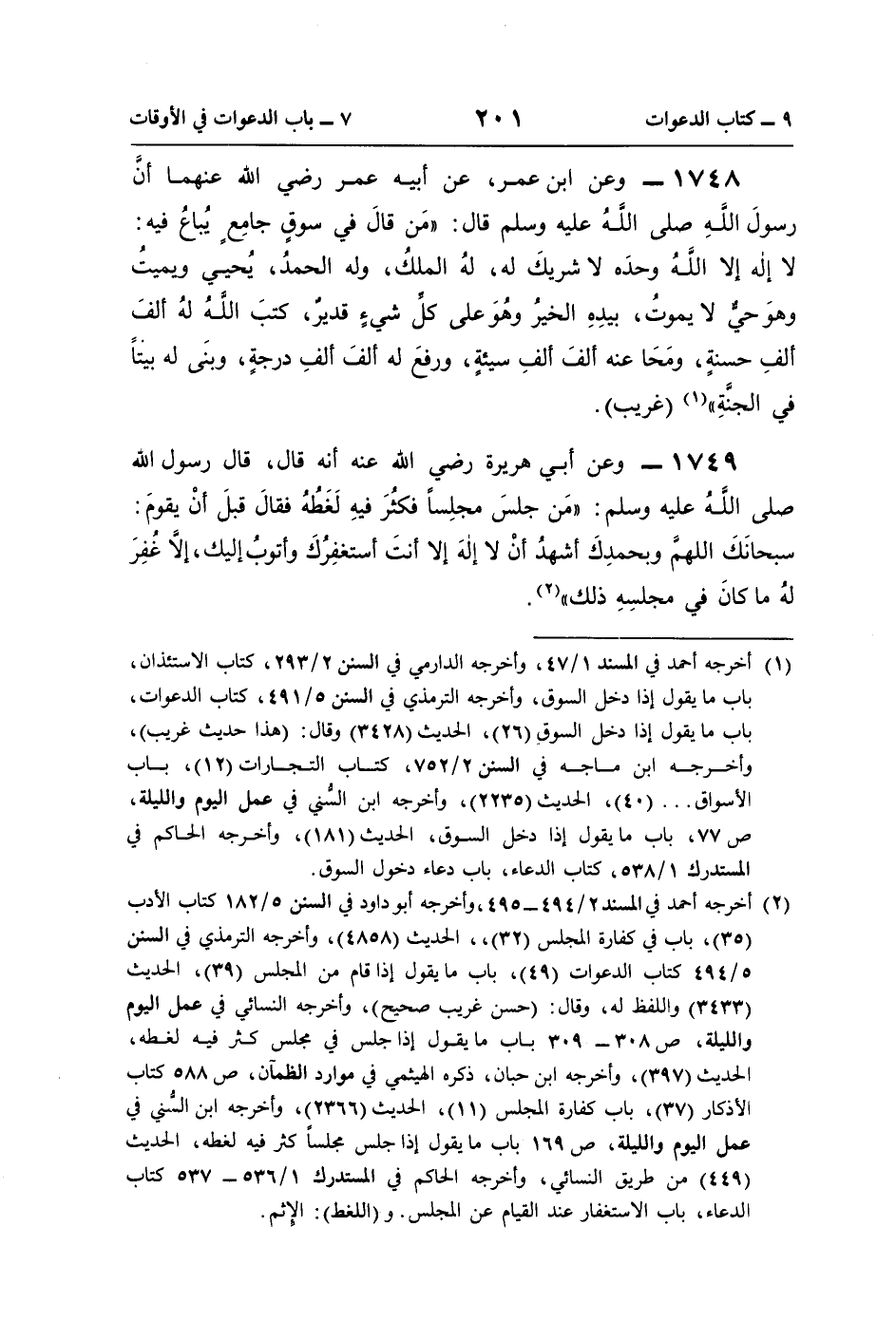 1748 - وعن ابن عمر، عن أبيه عمر رضي اللَّه عنهما أنَّ رسولَ اللَّهِ صلى اللَّهُ عليه وسلم قال: "مَن قالَ في سوقٍ جامِعٍ يُباعُ فيه: لا إله إلا اللَّهُ وحدَه لا شريكَ له، لهُ الملكُ، وله الحمدُ، يُحيي ويميتُ وهوَ حيٌّ لا يموتُ، بيدِهِ الخيرُ وهُوَ على كلِّ شيءٍ قديرٌ، كتبَ اللَّه لهُ ألفَ ألفِ حسنةٍ، ومَحَا عنه ألفَ ألفِ سيئةٍ، ورفعَ له ألفَ ألفِ درجةٍ، وبنَى له بيتًا في الجنَّةِ" (¬1) (غريب).