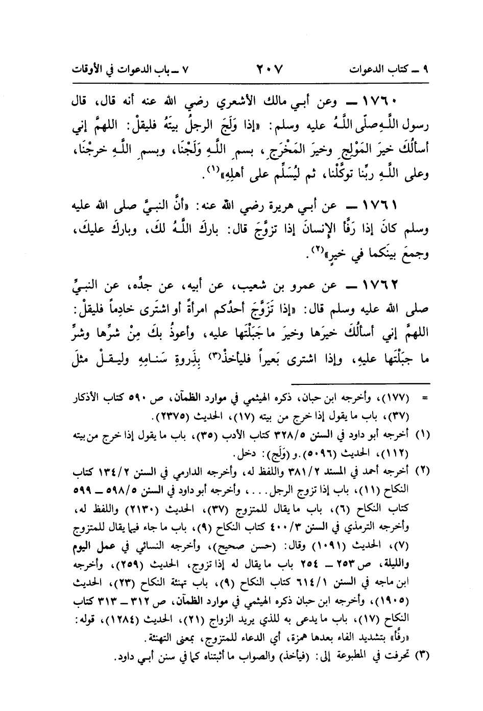 (¬2) أخرجه أحمد في المسند 2/ 381 واللفظ له، وأخرجه الدارمي في السنن 2/ 134 كتاب النكاح (11)، باب إذا تزوج الرجل. . .، وأخرجه أبو داود في السنن 5/ 598 - 599 كتاب النكاح (6)، باب ما يقال للمتزوج (37)، الحديث (2130) واللفظ له، وأخرجه الترمذي في السنن 3/ 400 كتاب النكاح (9)، باب ما جاء فيما يقال للمتزوج (7)، الحديث (1091) وقال: (حسن صحيح)، وأخرجه النسائي في عمل اليوم والليلة، ص 253 - 254 باب ما يقال له إذا تزوج، الحديث (259)، وأخرجه ابن ماجه في السنن 1/ 614 كتاب النكاح (9)، باب تهنئة النكاح (23)، الحديث (1905)، وأخرجه ابن حبان ذكره الهيثمي في موارد الظمآن، ص 312 - 313 كتاب النكاح (17)، باب ما يدعى به للذي يريد الزواج (21)، الحديث (1284)، قوله: "رفَّأ" بتشديد الفاء بعدها همزة، أي الدعاء للمتزوج، بمعنى التهنئة.