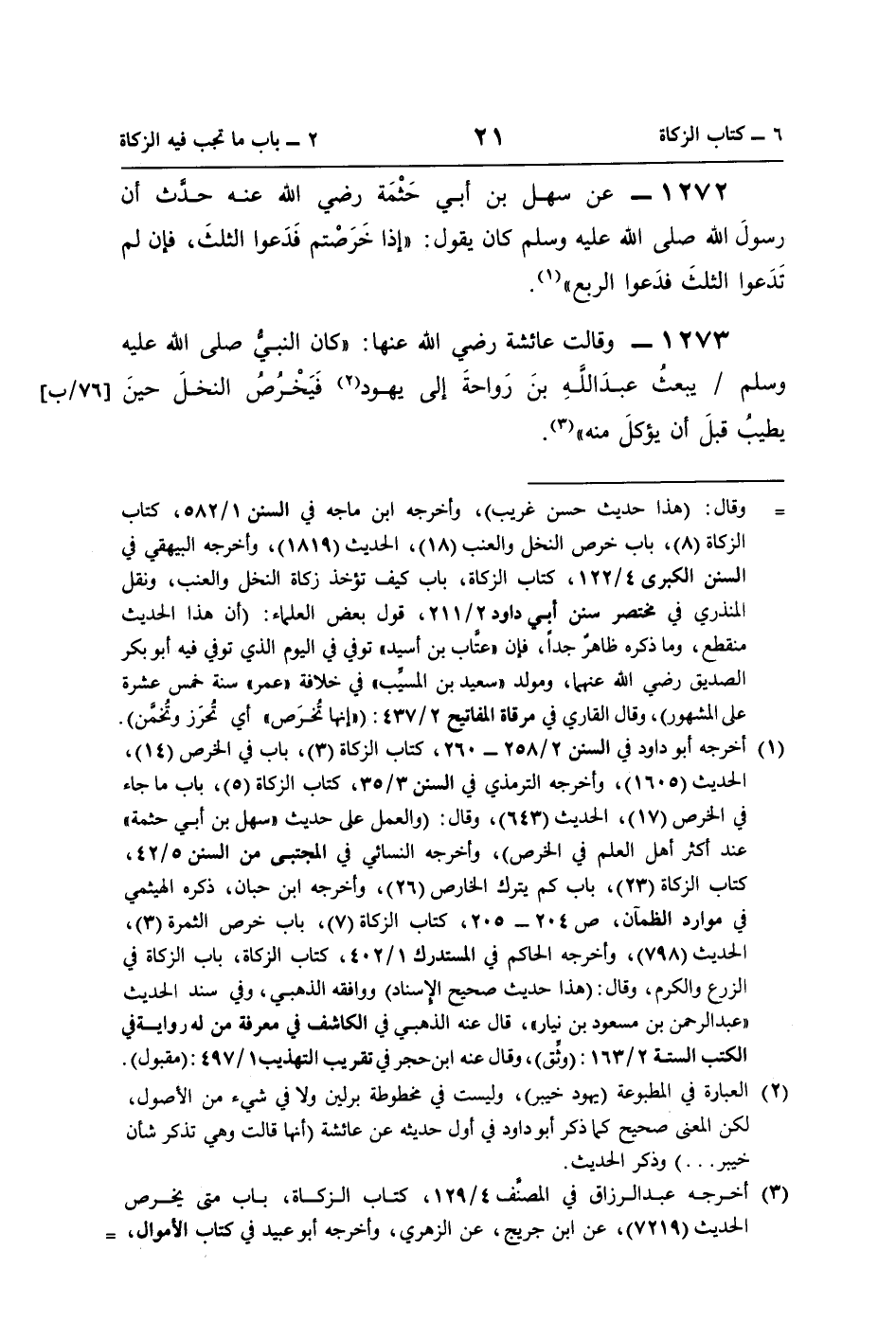 1273 - وقالت عائشة رضي اللَّه عنها: "كان النبيُّ صلى اللَّه عليه وسلم يبعثُ عبدَ اللَّهِ بنَ رَواحةَ إلى يهود (¬2) فَيَخْرُصُ النخلَ حينَ يطيبُ قبلَ أن يؤكلَ منه" (¬3).