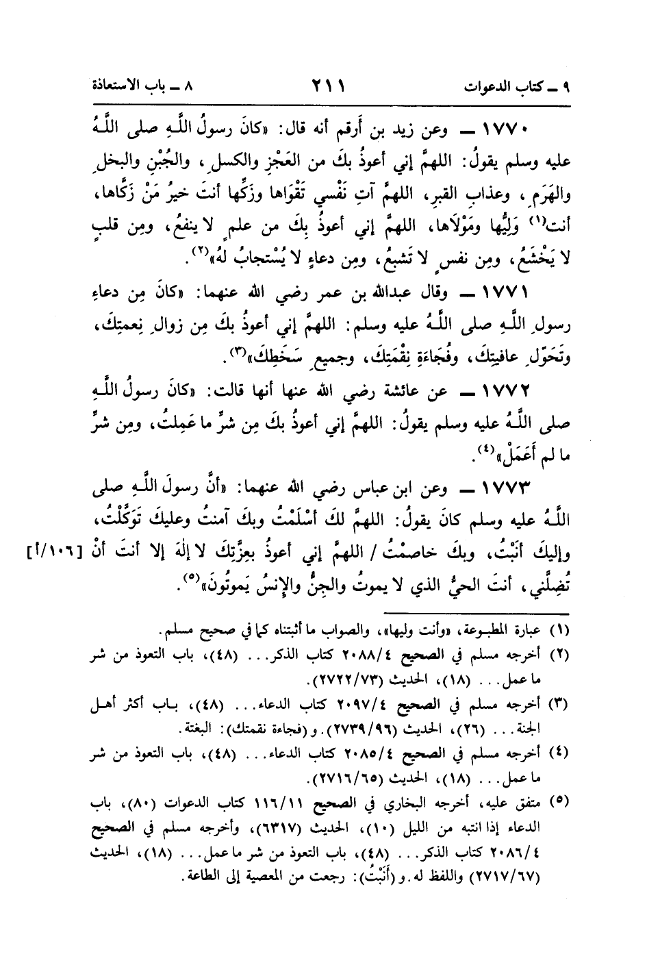 1770 - وعن زيد بن أَرقم أنه قال: "كانَ رسولُ اللَّهِ صلى اللَّهُ عليه وسلم يقولُ: اللهمَّ إني أعوذُ بكَ من العَجْزِ والكسلِ، والجُبْنِ والبخلِ والهَرَمِ، وعذابِ القبرِ، اللهمَّ آتِ نَفْسي تَقْوَاها وزَكِّها أنتَ خيرُ مَنْ زَكَّاها، أنت (¬1) وَليُّها ومَوْلَاها، اللهمَّ إني أعوذُ بِكَ من علمٍ لا ينفعُ، ومِن قلبٍ لا يَخْشَعُ، ومِن نفسٍ لا تَشبعُ، وْمِن دعاءٍ لا يُسْتجابُ لهُ" (¬2).