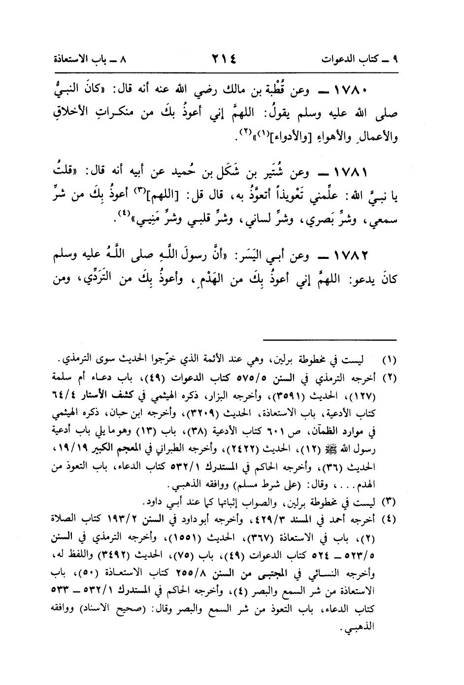 1780 - وعن قُطْبة بن مالك رضي اللَّه عنه أنه قال: "كانَ النبيُّ صلى اللَّه عليه وسلم يقولُ: اللهمَّ إني أعوذُ بكَ من منكراتِ الأخلاقِ والأعمالِ والأهواءِ [والأدواء] (¬1) " (¬2).