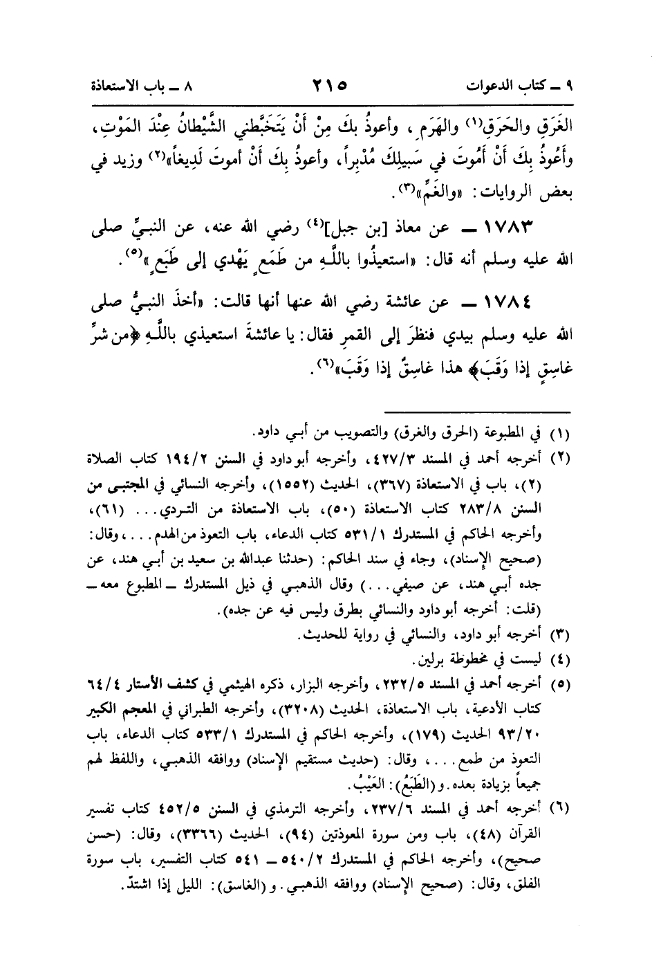 1784 - عن عائشة رضي اللة عنها أنها قالت: "أخذَ النبيُّ صلى اللَّه عليه وسلم بيدي فنظرَ إلى القمرِ فقال: يا عائشةَ استعيذي باللَّهِ {مِنْ شَرِّ غَاسِقٍ إِذَا وَقَبَ} هذا غاسِقٌ إذا وَقَبَ" (¬6).
