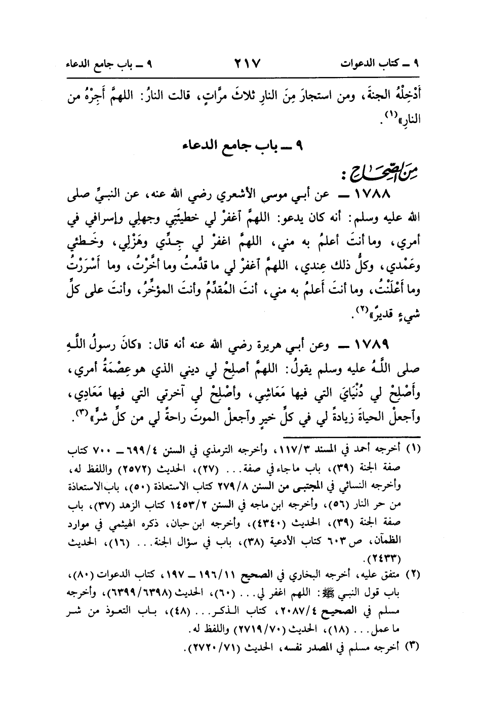 1788 - عن أبي موسى الأشعري رضي اللَّه عنه، عن النَّبيِّ صلى اللَّه عليه وسلم: أنه كان يدعو: اللهمَّ اغفرْ لي خطيئتِي وجهلِي وإسرافي في أمري، وما أنتَ أعلمُ به مني، اللهمَّ اغفرْ لي جِدِّي وهَزْلِي، وخَطئي وعَمْدي، وكلُّ ذلك عِندي، اللهمَّ أغفرْ لي ما قدَّمتُ وما أخَّرْتُ، وما أَسْرَرْتُ وما أَعْلَنْتُ، وما أنتَ أَعلمُ به مني، أنتَ المُقدِّمُ وأنتَ المؤخِّرُ، وأنتَ على كلِّ شيءٍ قديرٌ" (¬2).