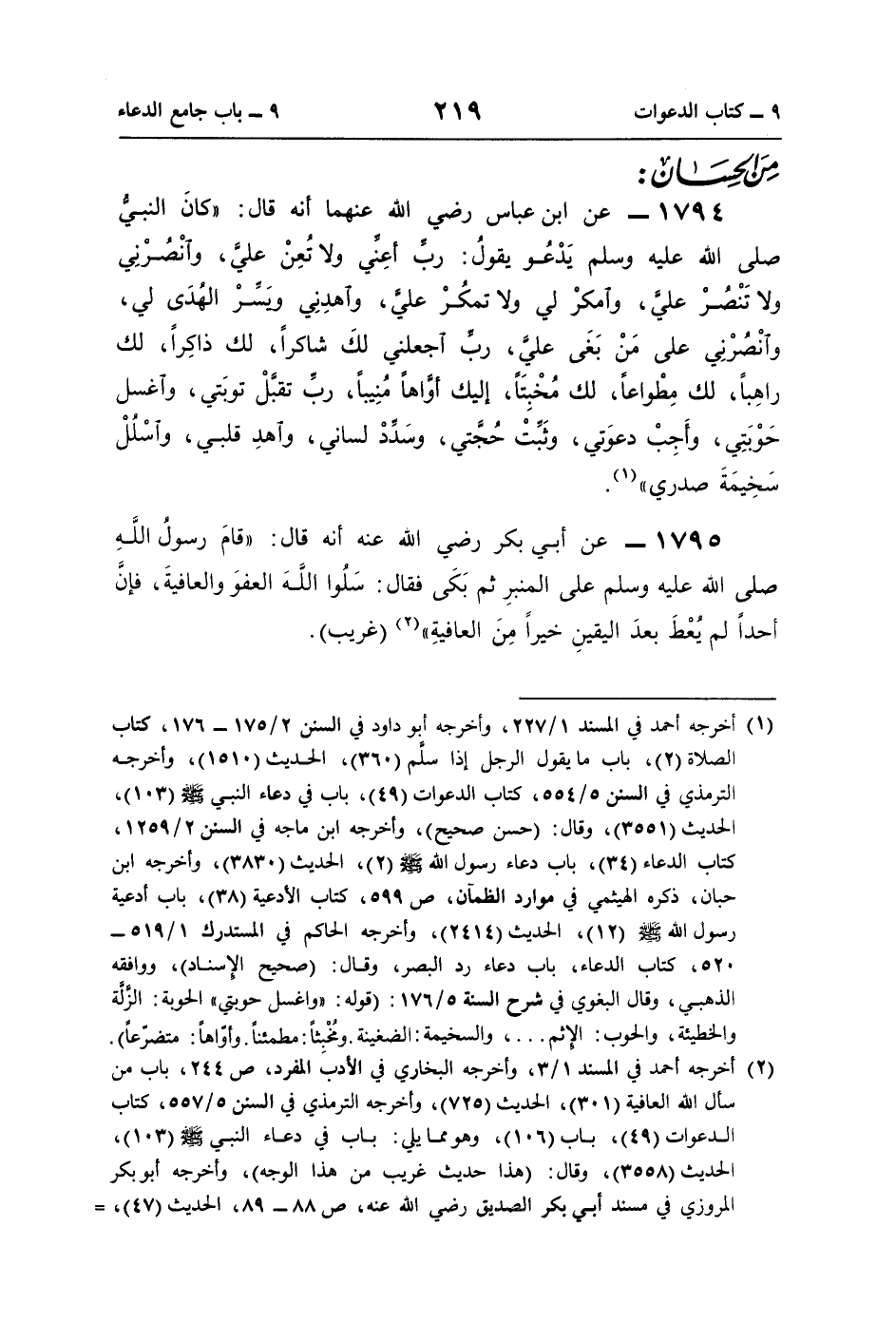 1794 - عن ابن عباس رضي اللَّه عنهما أنه قال: "كانَ النبيُّ صلى اللَّه عليه وسلم يَدْعُو يقولُ: ربِّ أعِنِّي ولا تُعِنْ عليَّ، وانْصُرْنِي ولا تَنْصُرْ عليَّ، وامكرْ لي ولا تمكُرْ عليَّ، واهدِنِي ويَسِّرْ الهُدَى لي، وانْصُرْنِي على مَنْ بَغَى عليَّ، ربِّ اجعلني لكَ شاكرًا، لك ذاكِرًا، لك راهِبًا، لك مِطْواعًا، لك مُخْبِتًا، إليك أوَّاهًا مُنِيبًا، ربِّ تقبَّلْ توبَتي، واغسل حَوْبَتِي، وأَجِبْ دعوَتي، وثَبتْ حُجَّتي، وسَدِّدْ لساني، واهدِ قلبي، واسْلُلْ سَخِيمَةَ صدري" (¬1).