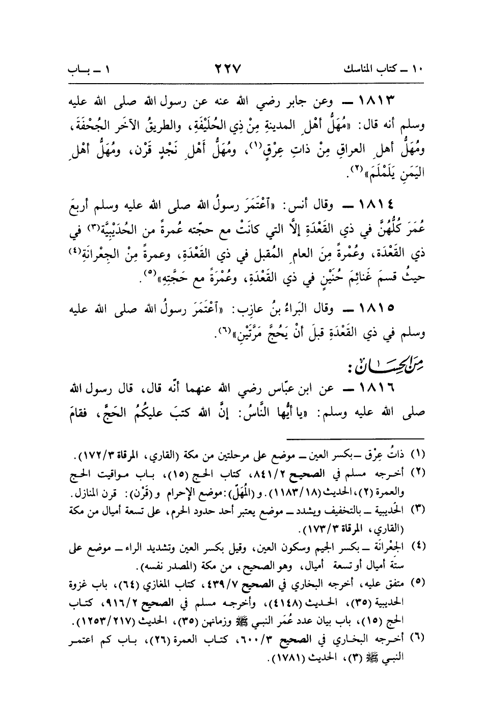 (¬2) أخرجه مسلم في الصحيح 2/ 841، كتاب الحج (15)، باب مواقيت الحج والعمرة (2)، الحديث (18/ 1183). و (المُهَل): موضع الإحرام و (قَرْن): قرن المنازل.