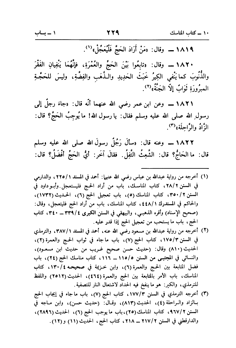 1821 - وعن ابن عمر رضي اللَّه عنهما أنّه قال: "جاءَ رجلٌ إلى رسولِ اللَّه صلى اللَّه عليه وسلم فقال: يا رسول اللَّه! ما يُوجِبُ الحَجَّ؟ قال: الزَّادُ والرَّاحِلَة" (¬3).
