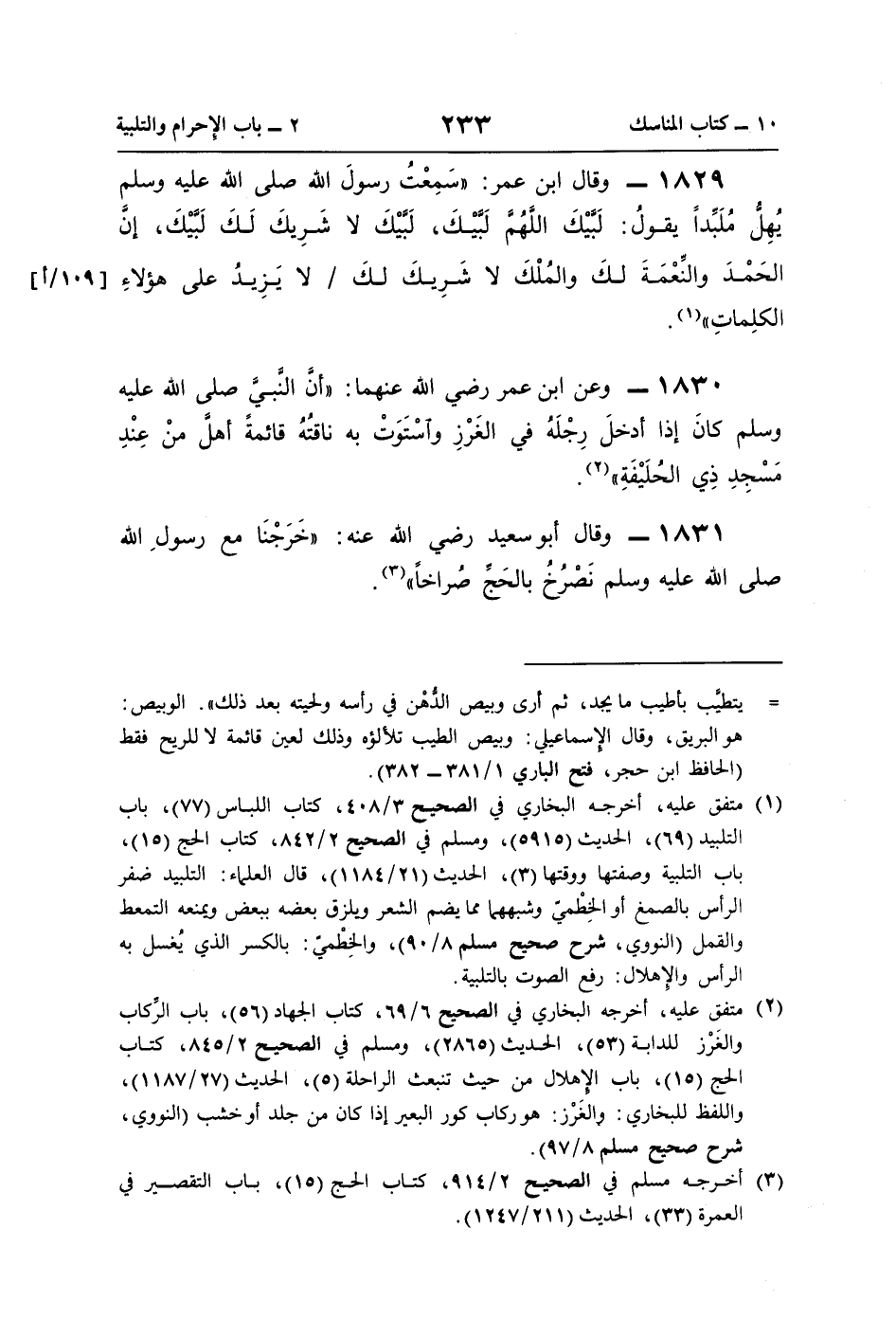 1829 - وقال ابن عمر: "سَمِعْتُ رسولَ اللَّه صلى اللَّه عليه وسلم يُهِلُّ مُلَبِّدًا يقولُ: لَبَّيْكَ اللَّهُمَّ لَبَّيْكَ، لَبَّيْكَ لا شَرِيكَ لَكَ لَبَّيْكَ، إنَّ الحَمْدَ والنِّعْمَةَ لكَ والمُلْكَ لا شَرِيكَ لكَ لا يَزِيدُ على هؤلاءِ الكلِماتِ" (¬1).