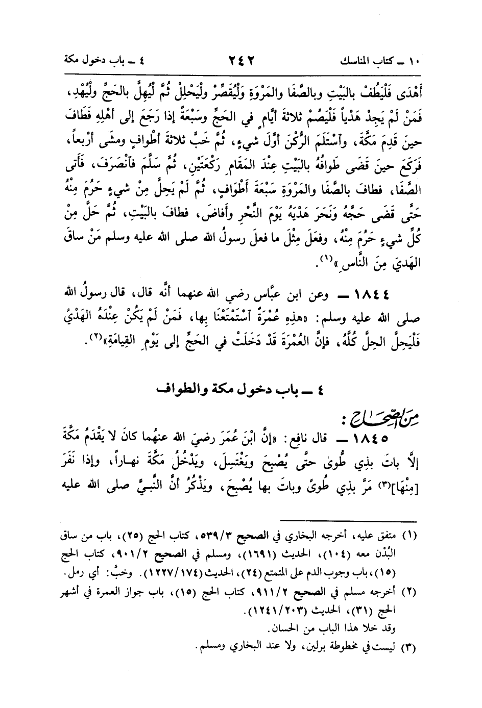 1845 - قال نافِع: "إنَّ ابْنَ عُمَرَ رضيَ اللَّه عنهُما كانَ لا يَقْدَمُ مَكَّةَ إلَّا باتَ بذِي طُّوى حتَّى يُصْبحَ ويَغْتَسِلَ، ويَدْخُلُ مَكَّةَ نهارًا، وإذا نَفَر [مِنْهَا] (¬3) مَرَّ بذِي طُوًى وباتَ بها يُصْبحَ، وَيذْكُرُ أنَّ النَّبيَّ صلى اللَّه عليه